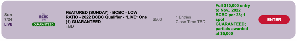 It’s a $500 Low Ratio qualifier. The winning ratio is 1-per-23, and at least one $10,000 entry is certain to be awarded in the Live-format tourney.