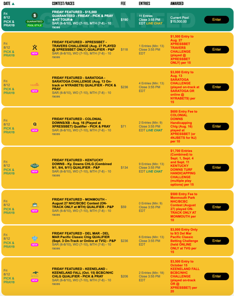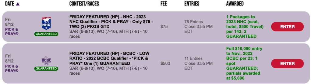 Back on the slate, of course, on Sunday are qualifiers to The BIG One (one seat guaranteed), the Keeneland Fall BCBC/NHC Challenge, the Del Mar Pacific Challenge, the Colonial Downs Handicapping Challenge (Last Chance!), the Kentucky Downs Challenge and the August 27 Monmouth NHC/BCBC contest. All of these are Pick & Prays.