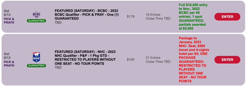 The NHC qualifier is a “regular,” $165 Pick & Pray with two spots guaranteed and a winning ratio of 1-per-65, but it’s only for those who have yet to earn a 2023 seat. It’s a great opportunity to punch your ticket to Vegas without having to defeat some of the contest stalwarts out there.
