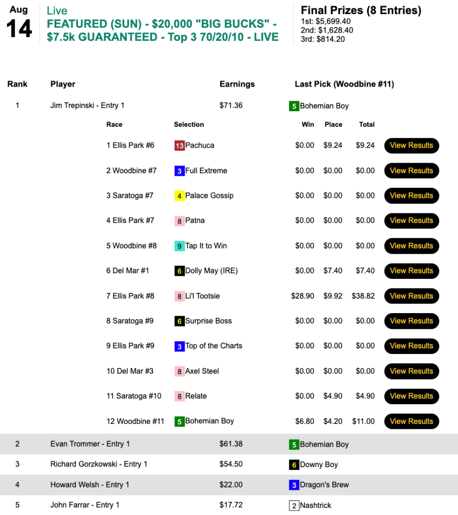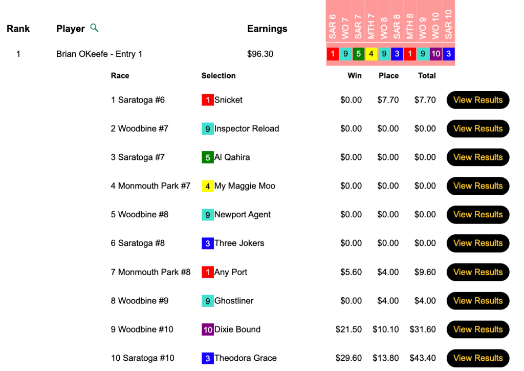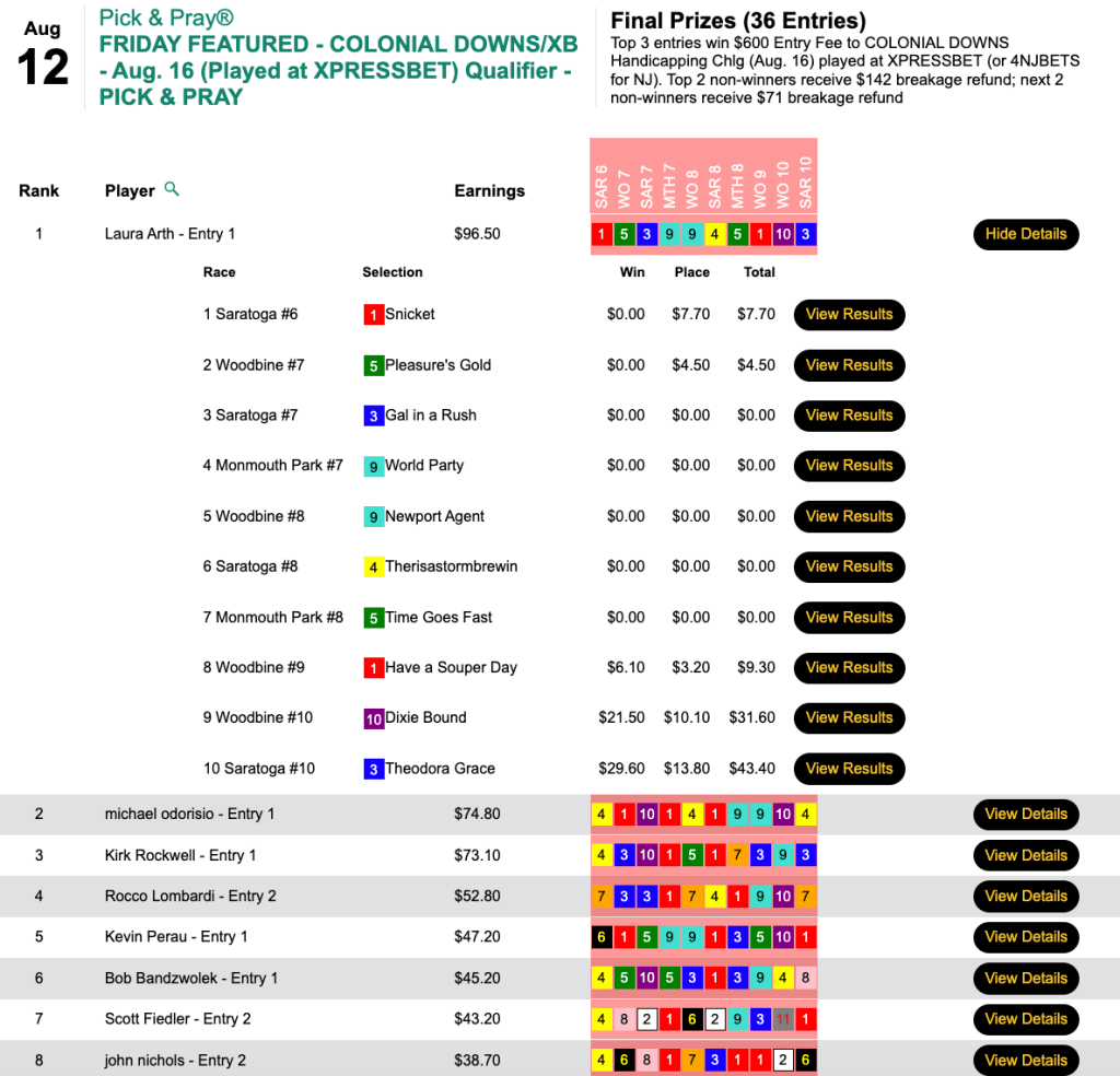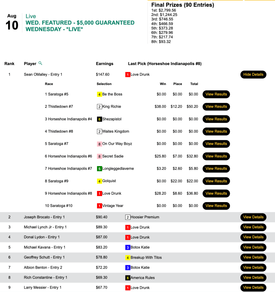 O’Malley’s score of $147.60—recorded over just 10 races— was the highest total accumulated all week. Among his 4 wins and a place in Wednesday’s $5,000 Guaranteed cash game, Rockwell had winners at 15-1, 11-1 and 13-1, and he also added a max $22.00 place collection for good measure. O’Malley earned $2,799 in a game ultimately worth $6,221.