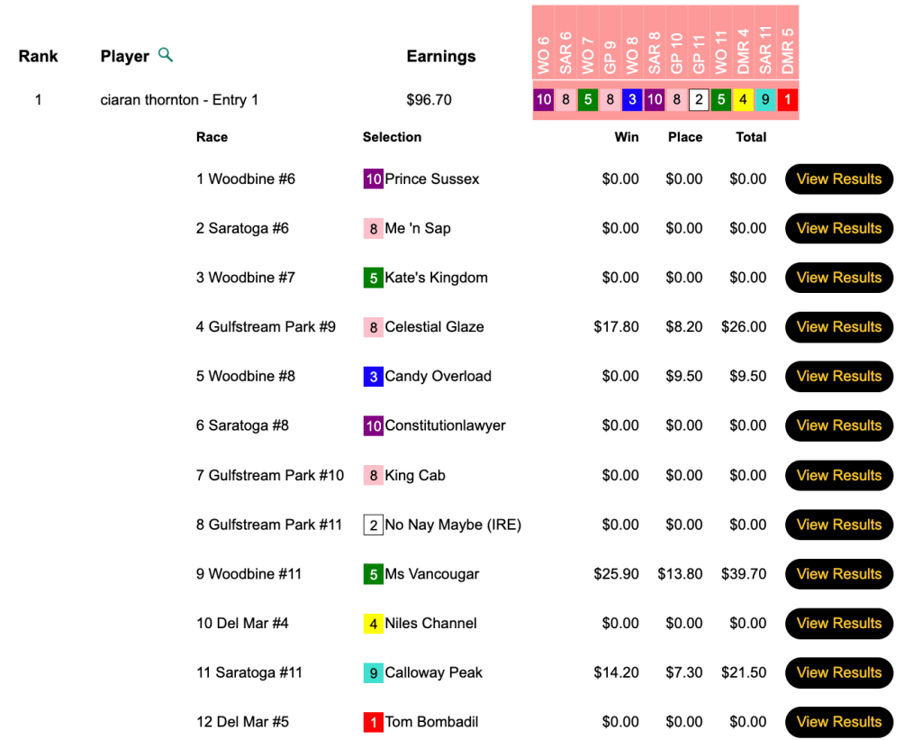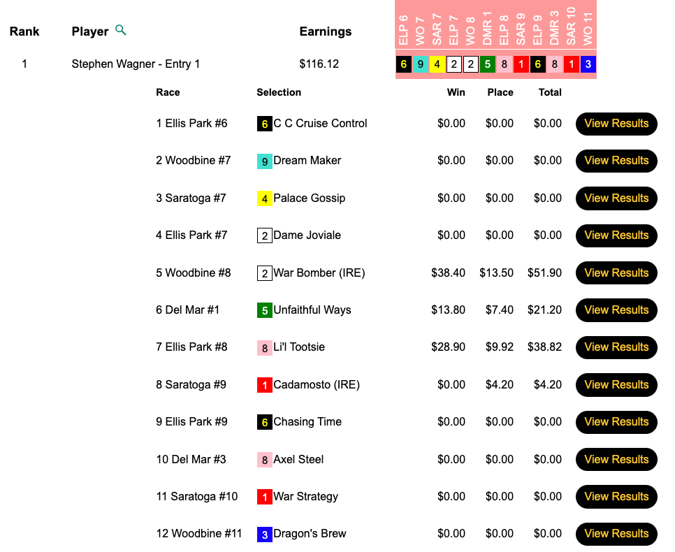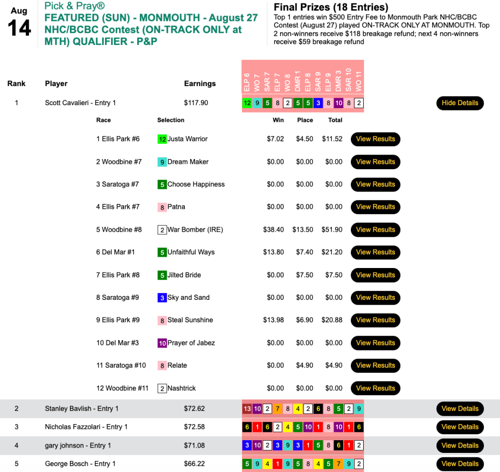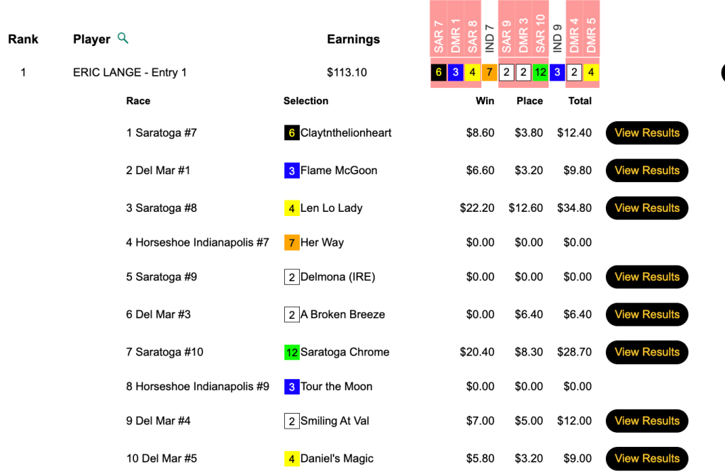 Sunday was the first day in which Ellis Park was part of our multi-track featured-tourney schedule, and so there were some funny looking win and place payoffs on our leaderboards. Double kudos, therefore to Scott Cavalieri (4 wins, 2 places) for not just generating the day’s biggest tally here…but for getting his Ellis Park pennies to even out to a nice, fairly-round $117.90. (For the record, Cavalieri won his $500 Monmouth seat by $45.28.)