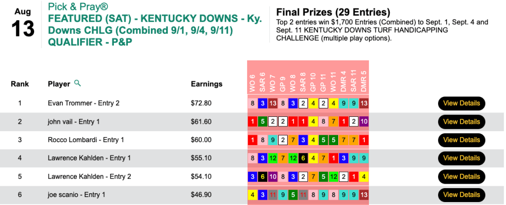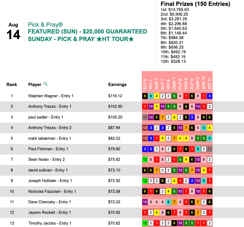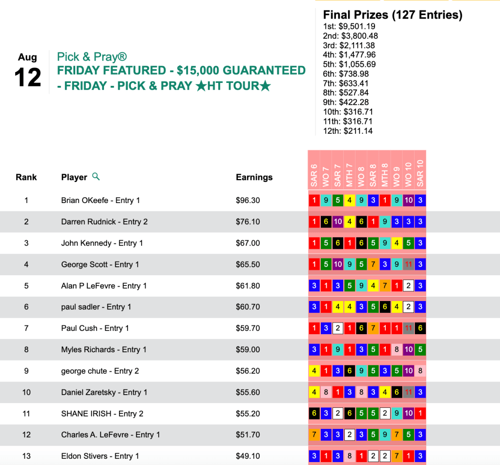 On Saturday, we hosted the week’s richest game, our $30,000 Guaranteed Pick & Pray…which did well better than that, since the final purse came to $35,112.