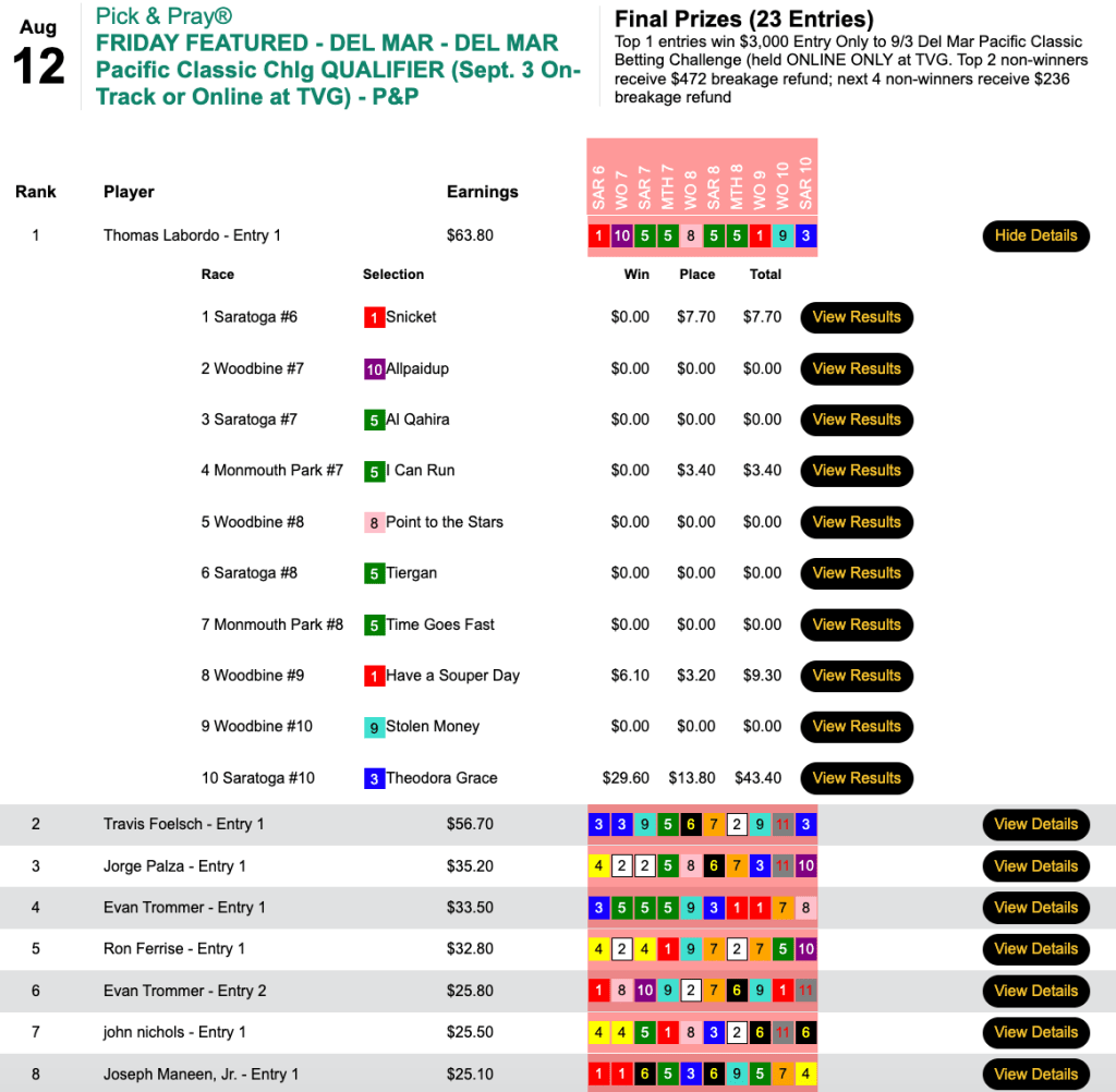 That one, plus one other winner and two runners up, brought Labordo a $3,000 entry in Friday’s Del Mar Pacific Classic Challenge qualifier.