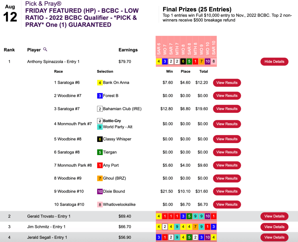 Fresh off an effort that earned him $21,000 in the Spa & Surf Showdown, Anthony Spinazzola capture the other Friday feature at HorsePlayers, our Low Ratio Breeders’ Cup Betting Challenge Pick & Pray.