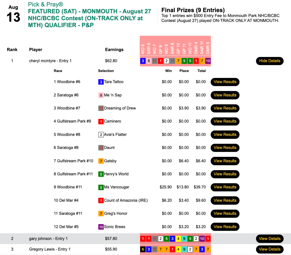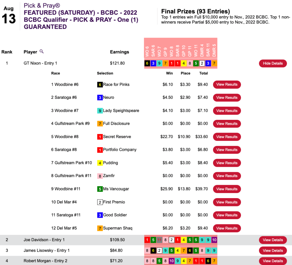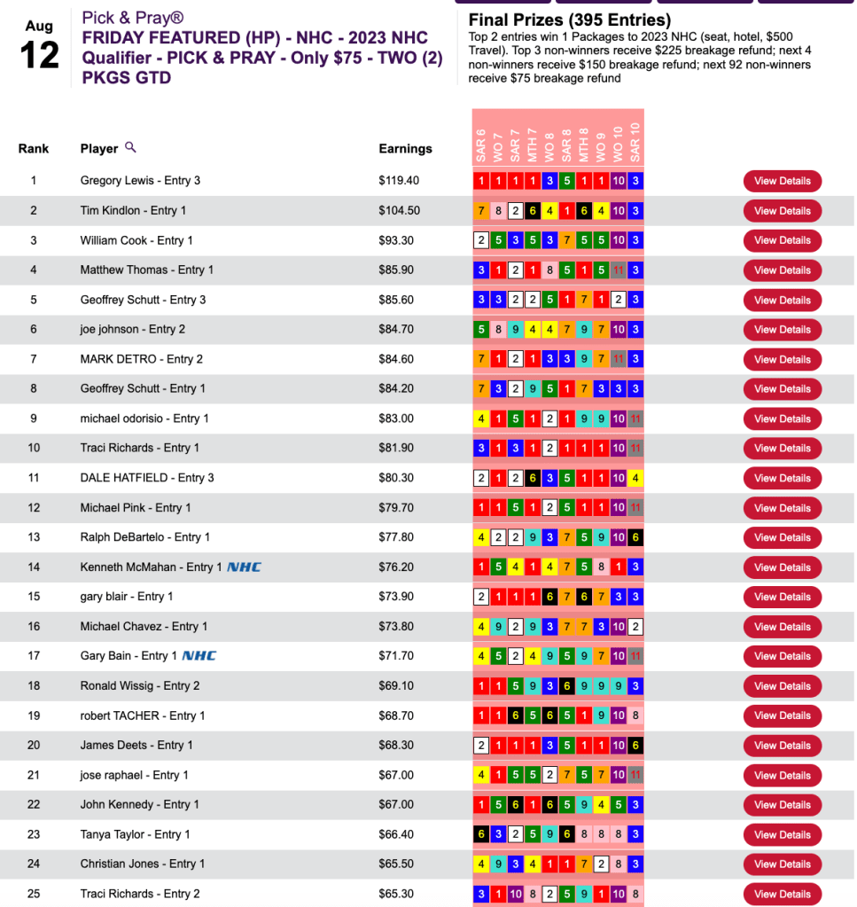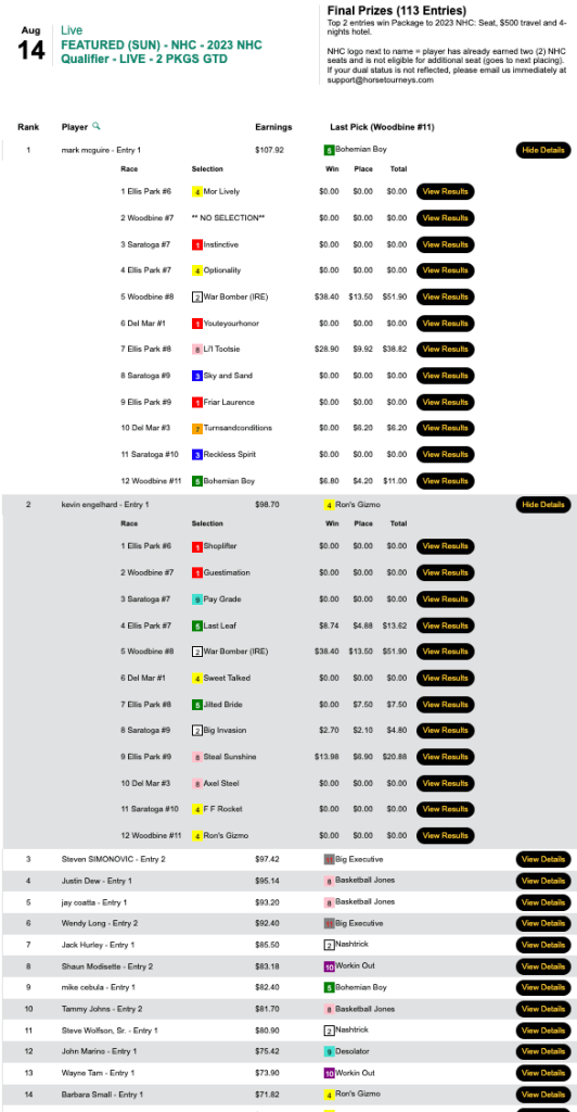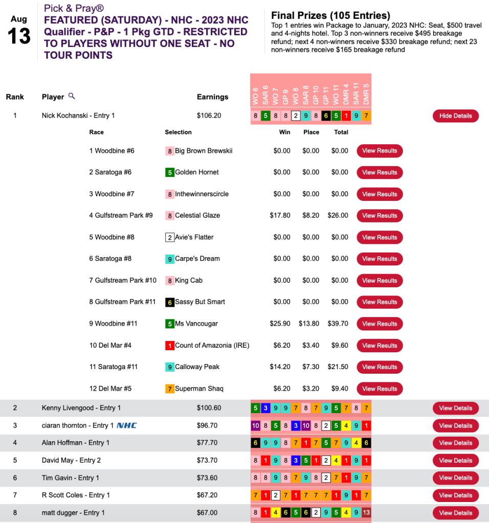 The other feature on Saturday at HorsePlayers was a $165 NHC qualifier restricted to those who had yet to earn a 2023 seat.
