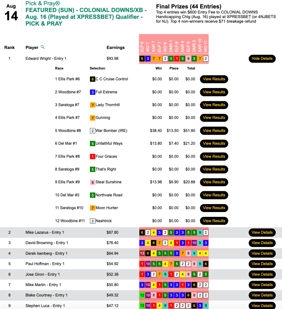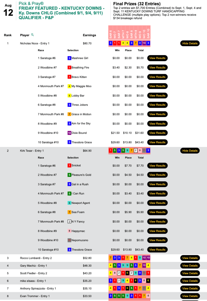 He (2 wins, 3 places) and Henry Karsen (3W, 4P) were the two players to score in the 80s and, hence, they were the two to grab $600 seats for tomorrow’s Colonial Downs Handicapping Challenge. Oddly, not a single one of their 12 combined collections were held in common.