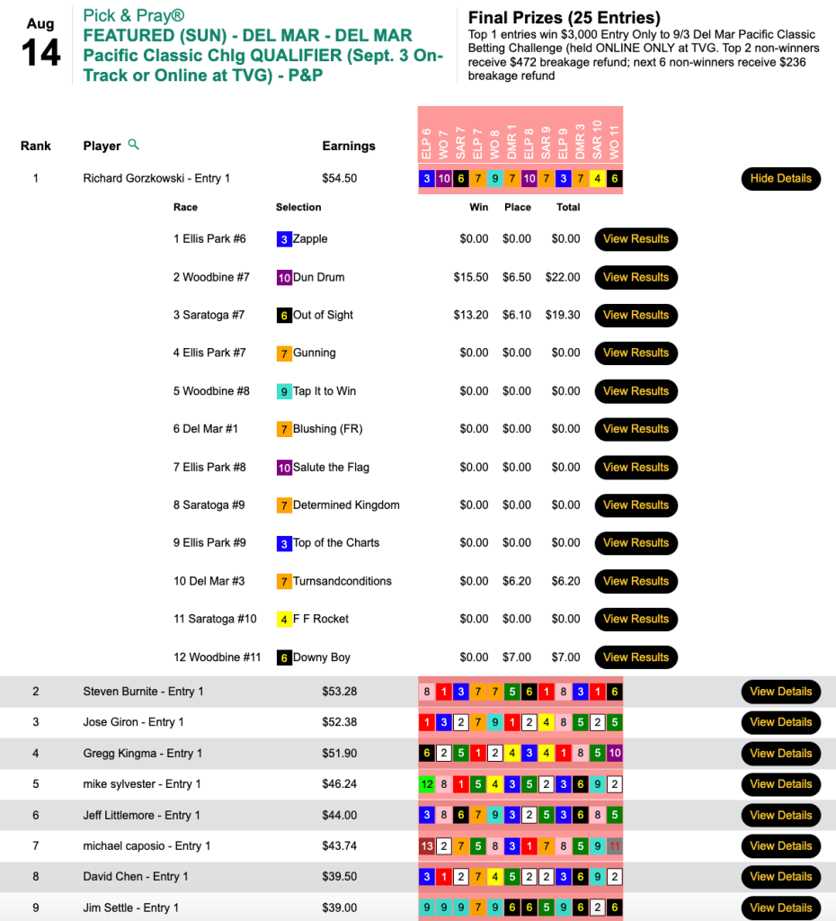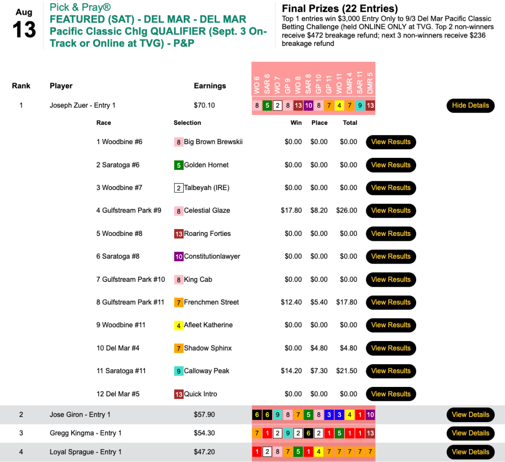 The same picks that won Zuer the 9-player Big Bucks game also did just fine in Saturday’s 22-entry Del Mar Pacific Classic Challenge play-in.