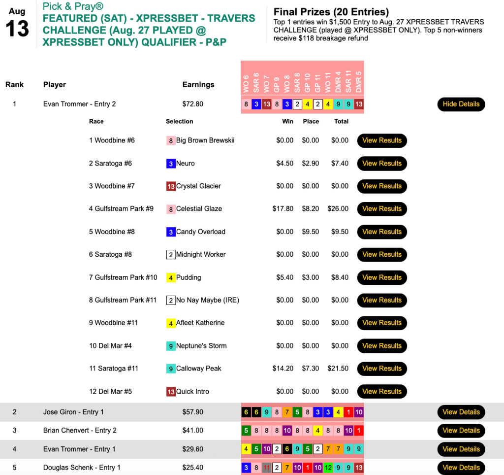 With 4 winners, led by Celestial Glaze ($17.80, $8.20 in the 9th at Gulfstream), Trommer bagged a $1,500 entry for the Travers Challenge at Xpressbet.