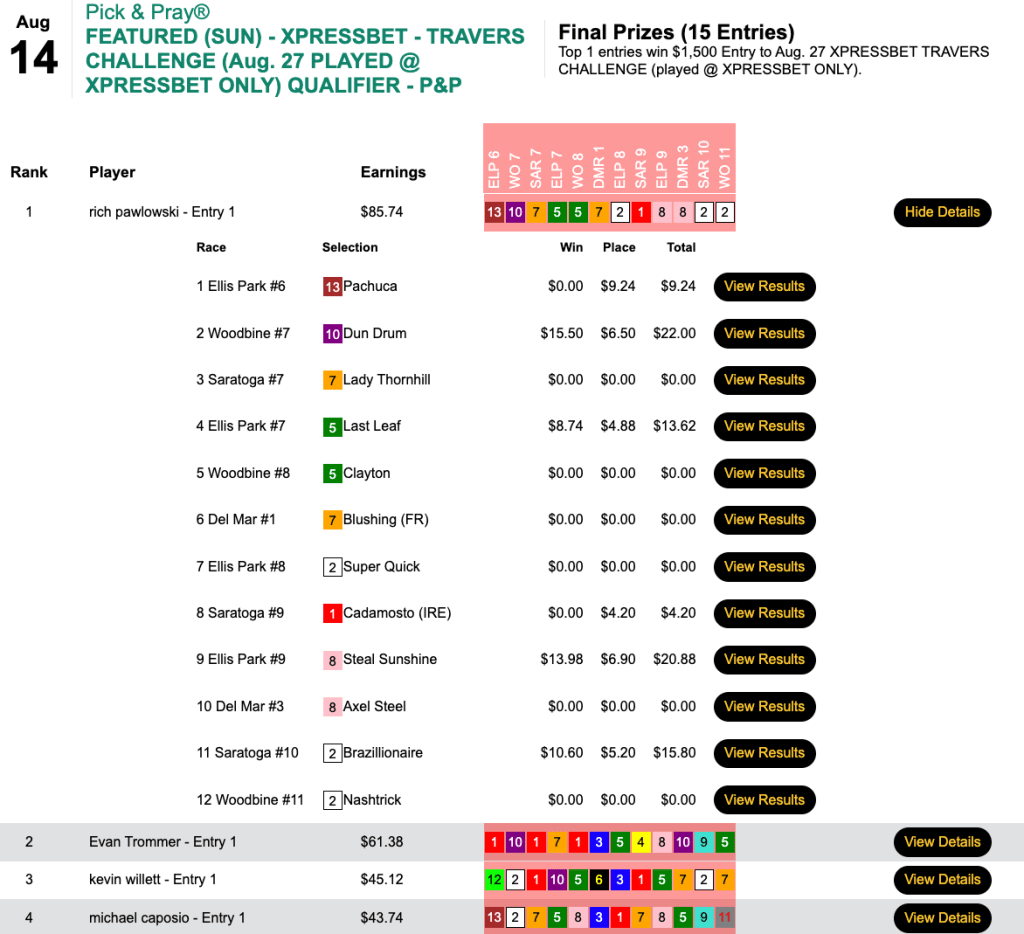 Pawlowski (4 wins, 2 places) will now be in the August 27th field at Xpressbet for the Travers Challenge.