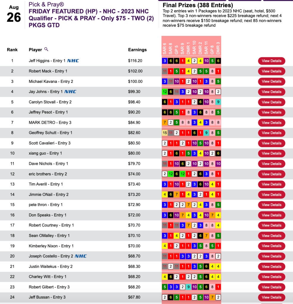 Rewinding back to Friday action, Jeff Higgins finished first in the day’s $75 NHC qualifier at HorsePlayers.