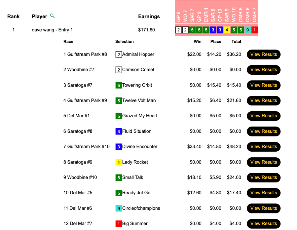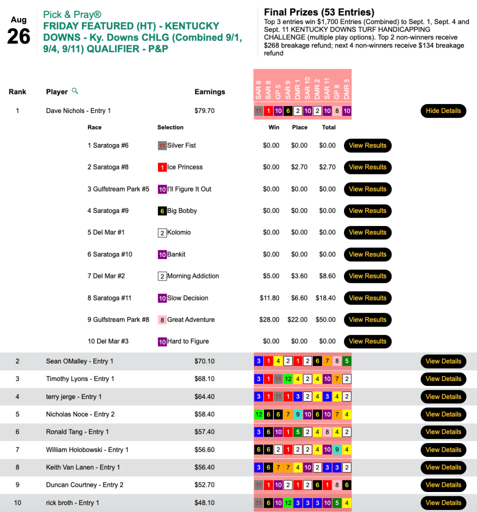 Each day of the weekend saw three garner $1,700 worth of entry fees for the Turf-only test. Friday’s were Dave “Gambling Actuary” Nichols (3 wins, 1 place), Sean O’Malley (2W, 1P) and Timothy Lyons (4W, 2P). Nichols and O’Malley each had Great Adventure. Lyons was not part of that thrill ride, and he, therefore, needed more collections to get up and into the money.