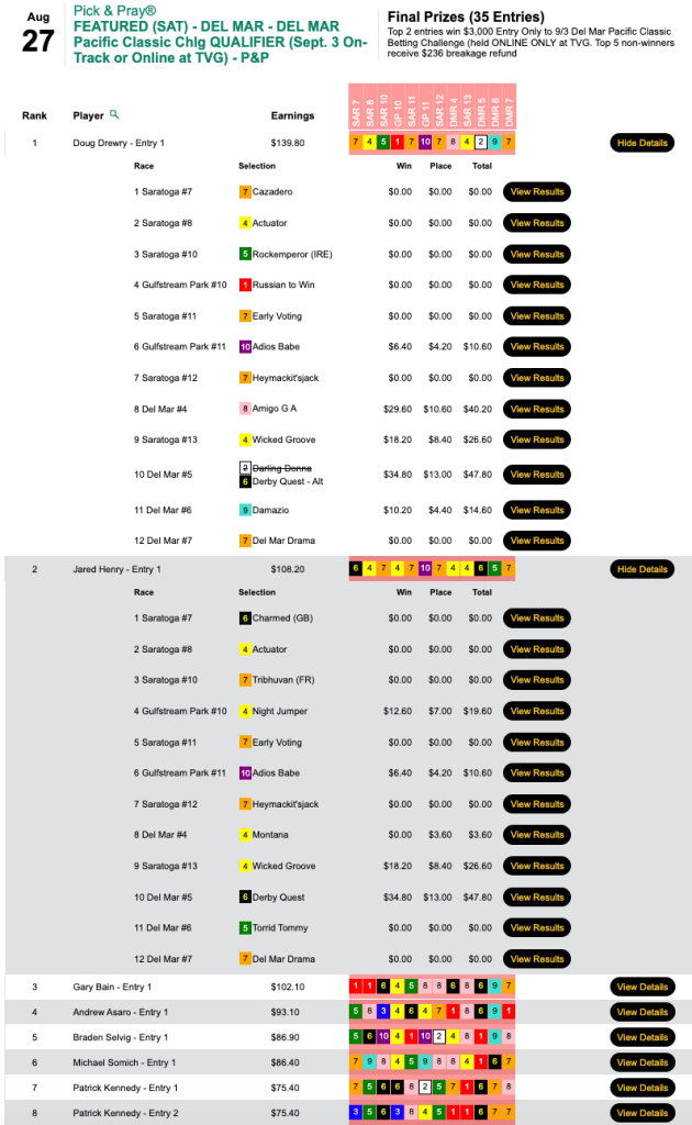 Doug Drewry (5 wins, 0 places) and Jared Henry (4W, 1P) were the two winners of $3,000 entries in Saturday’s Del Mar Pacific Classic Challenge Pick & Pray.