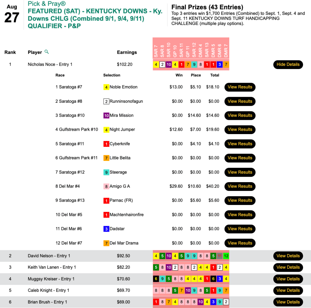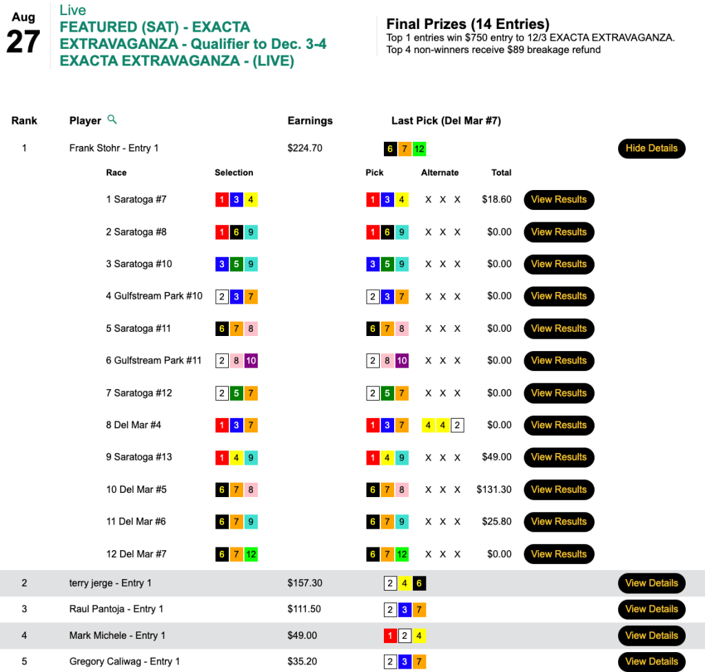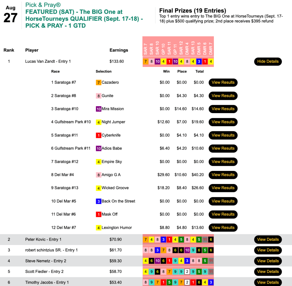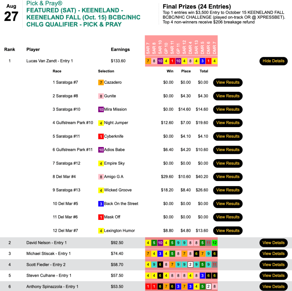 The Month-End Blowout was a Live-format game, but Van Zandt apparently played it like a Pick & Pray. In an impressive display of prescience, he used all 12 horses on his $133.60-entry in three other “set-it-and-forget it” tourneys on Saturday.