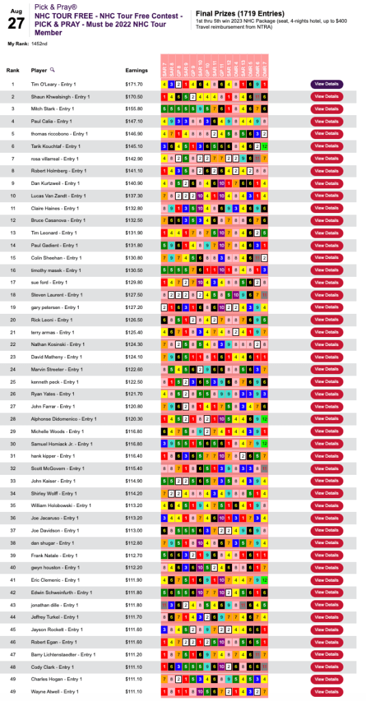 Tim O’Leary had a 15-race score of $171.50 to lead the way in Saturday’s free 5-seat NHC qualifier at HorsePlayers.