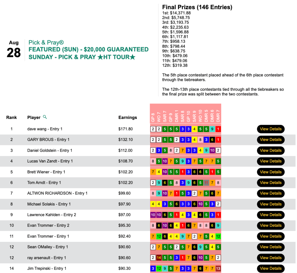 …and he was rewarded to the tune of $14,371 in Sunday’s HT Tour event, our $20,000 Guaranteed Pick & Pray, which ultimately paid out a total of $31,397. Wang’s giant performance deprived Gary Brous of what would have been a fourth Sunday victory (and 10th of the previous two weeks). Instead, Brous had to make do with second money of $5,748.