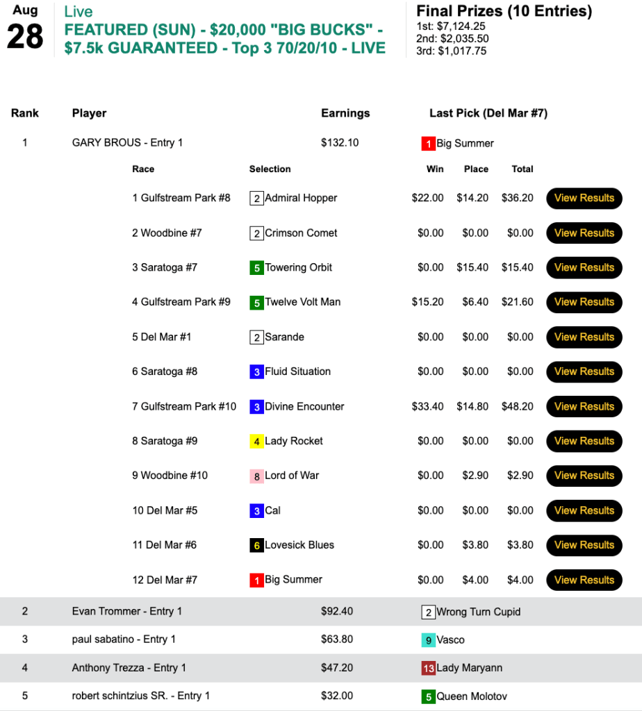 Zuer counted Derby Quest ($34.40, $13.00) in the 5th at Del Mar among his 3 winners and 2 runners up. Zuer bagged $9,973 in the day’s $10,000 Guaranteed Big Bucks Pick & Pray, which closed up shop with a total purse of $14,248.