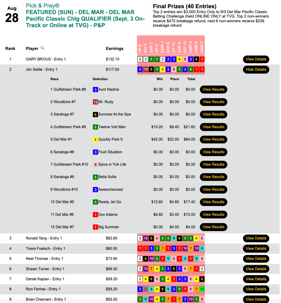 Nevertheless, both earned $3,000 seats on Friday for this Saturday’s Pacific Classic Challenge, playable on-track at Del Mar or at TVG.com.