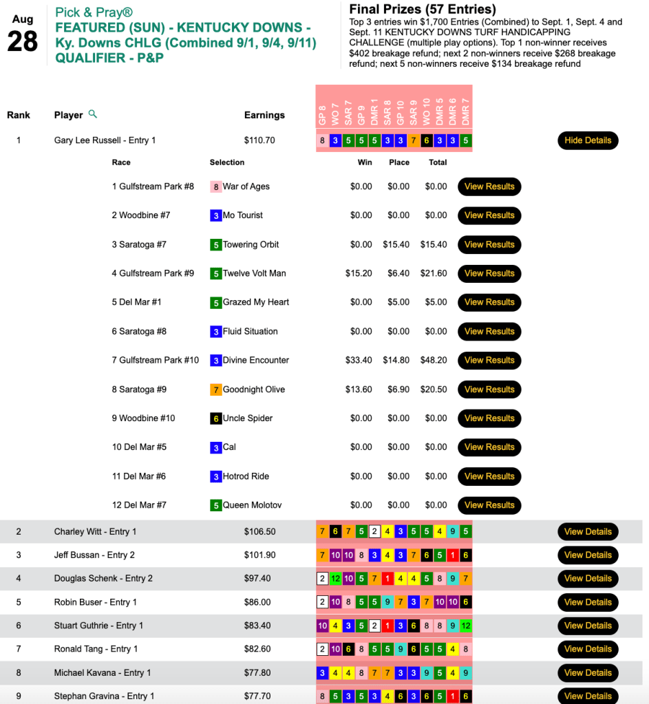 On Sunday, the three to squirrel away Kentucky Downs berths were Gary Lee Russell (3 wins, 2 places), Charley Witt (4W, 2P) and Jeff Bussan (5W, 0P despite whiffing on the first 5 contest races).