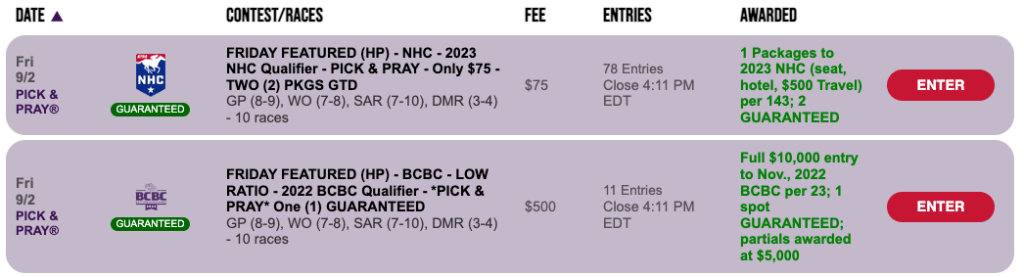 Friday’s NHC play-in is a $75 Pick & Pray with two seats guaranteed and a winning ratio of 1-per-143. Entries are limited to three per person. Remember—you must be a 2022 NHC Tour member, prior to the start of the contest, in order to be eligible for an NHC package in this or any other NHC qualifier. If you’re not a member, you can become one quickly and easily at NTRA.com for a $50 membership fee.