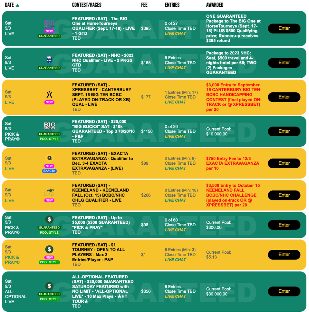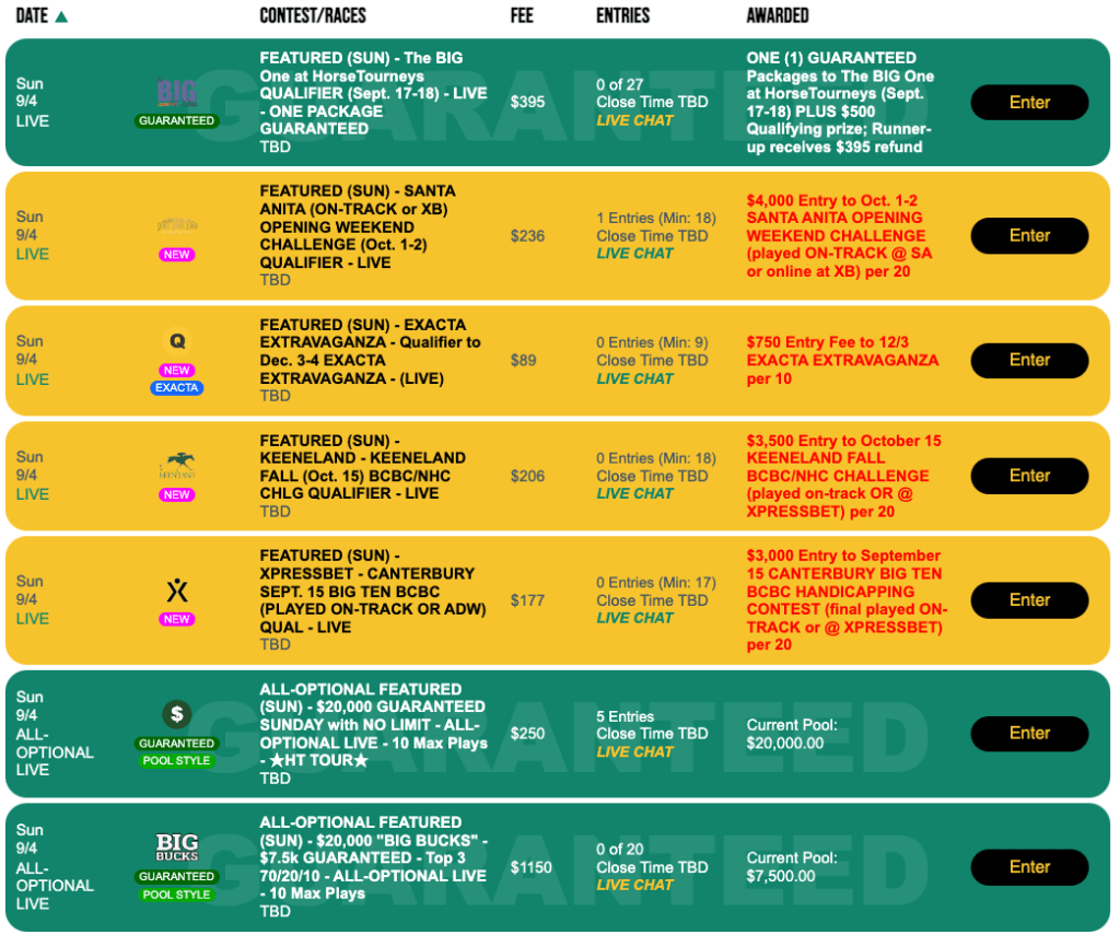 The All Optional Live battle (the last one showing on the above graphic) is Saturday’s HT Tour event, our $30,000 Guaranteed game. It’s $350 to enter. Eligible contest races are 7th through 13 at Saratoga, the 5th through 11th at Kentucky Downs and the full, 11-race, Pacific Classic Day card from Del Mar. Choose your horses wisely—and your races too.