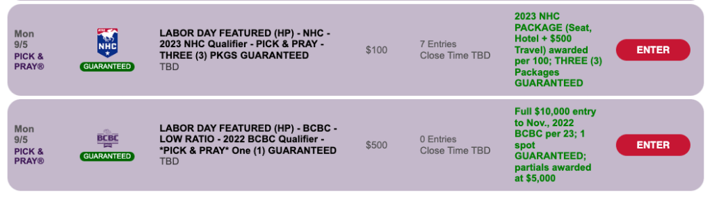 Labor Day weekend offers a total of four HT Tour events (one per day). The first of those is our $15,000 Guaranteed No Limit Pick & Pray. An entry fee of $190 holds the promise of getting your holiday period off in grand style.