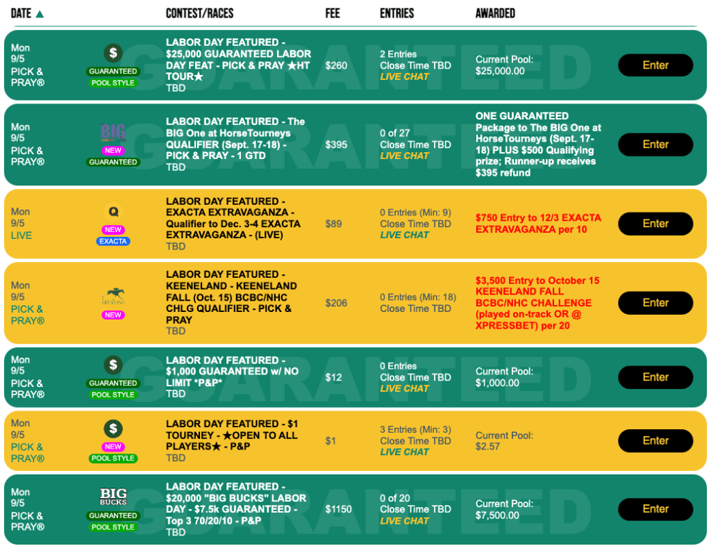 On Labor Day, we switch back to Pick & Pray format (for all but the Exacta Extravaganza qualifier). Two of the agenda items are our fourth HT Tour event and third Big Bucks game of the weekend.