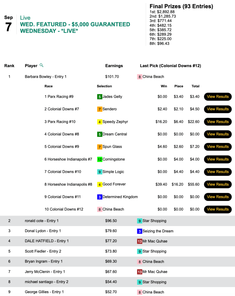 Barbara Bowley bagged $2,892 for her 4-win, 3-place effort in Wednesday’s $5,000 Guaranteed cash tourney. Bowley’s biggest return came with Good Forever ($39.40, $16.20) in the 8th at Horseshoe Indianapolis. The final prize pool here amounted to $6,428.