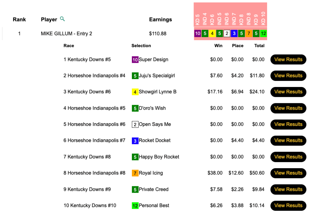 Perhaps more important from Gillum’s perspective was that he also earned $3,515…in Thursday’s $6,000 Guaranteed Pick & Pray, which closed with a pot of $7,811. Gillum swept the final three contest races—starting with Royal Icing ($38.00, $12.60 in the 8th at Horseshoe Indy)—to finish with 5 firsts and 1 second. Here’s how his day went: