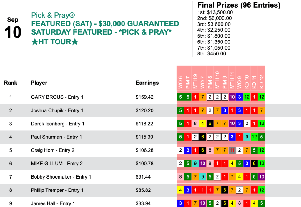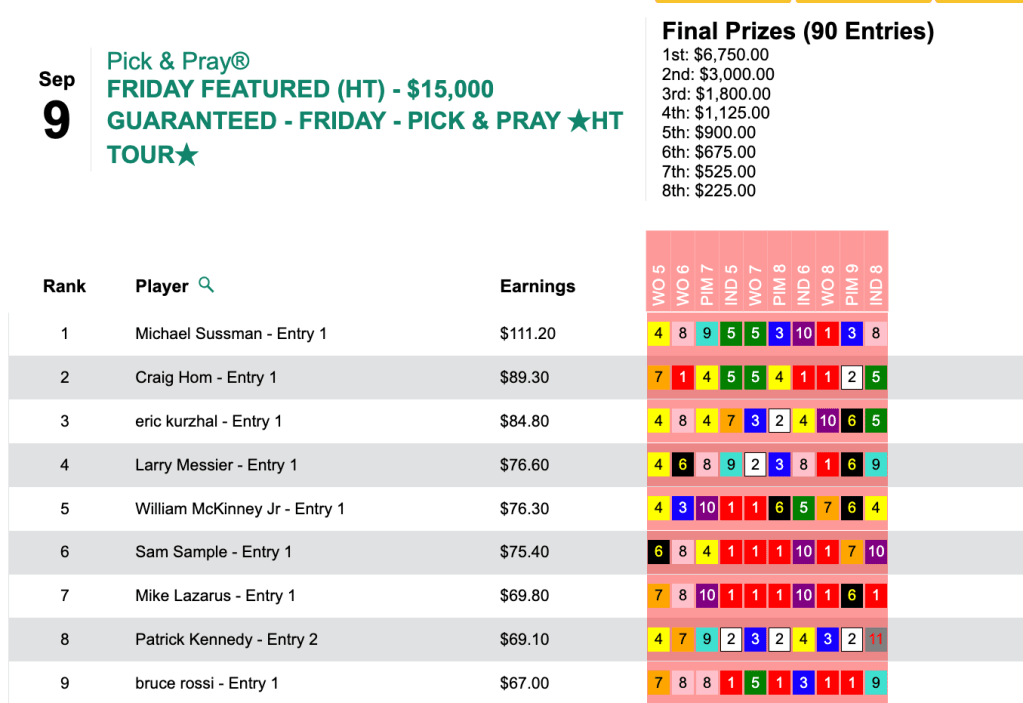The front-loaded assortment of 5 winners yielded Sussman the top prize of $6,750 in Friday’s HT Tour competition, our $15,000 Guaranteed Pick & Pray.