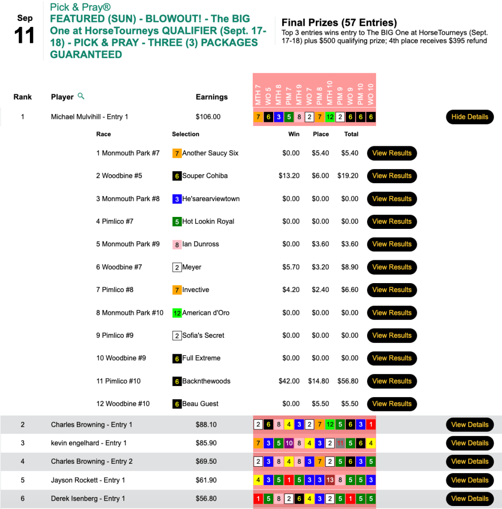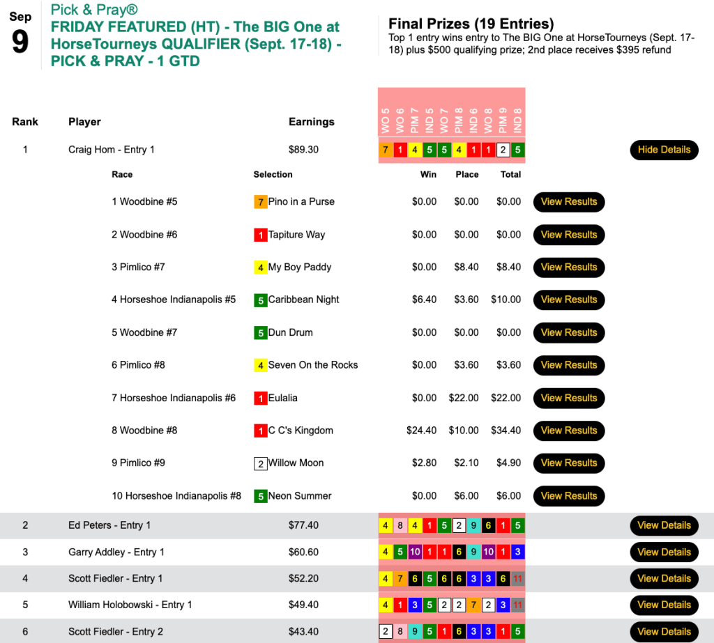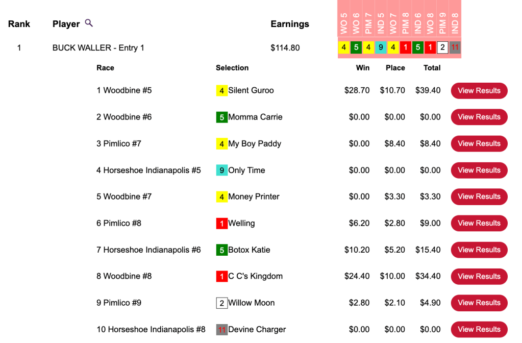 Friday’s best score was recorded over at HorsePlayers by Buck Waller.