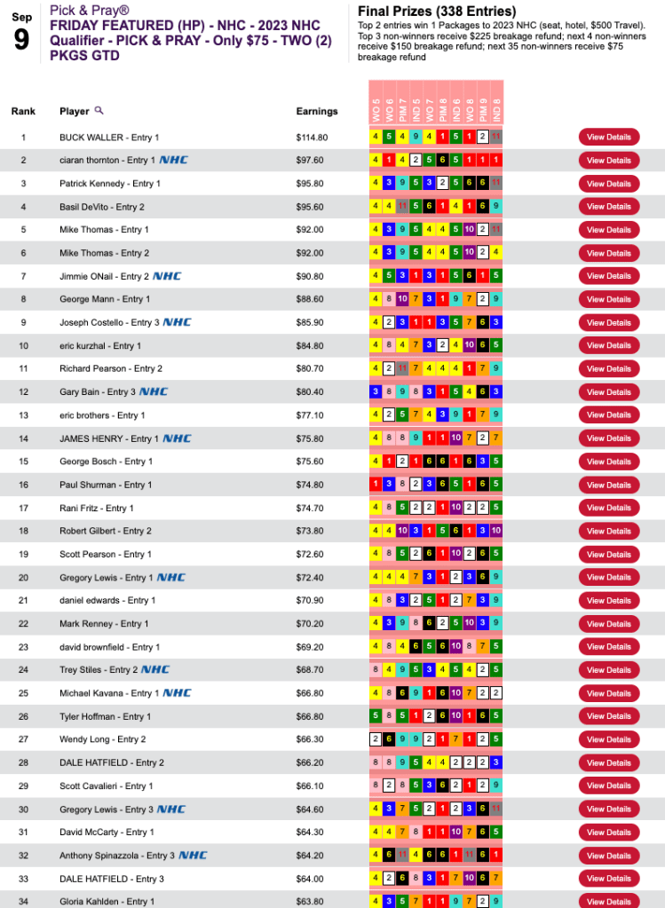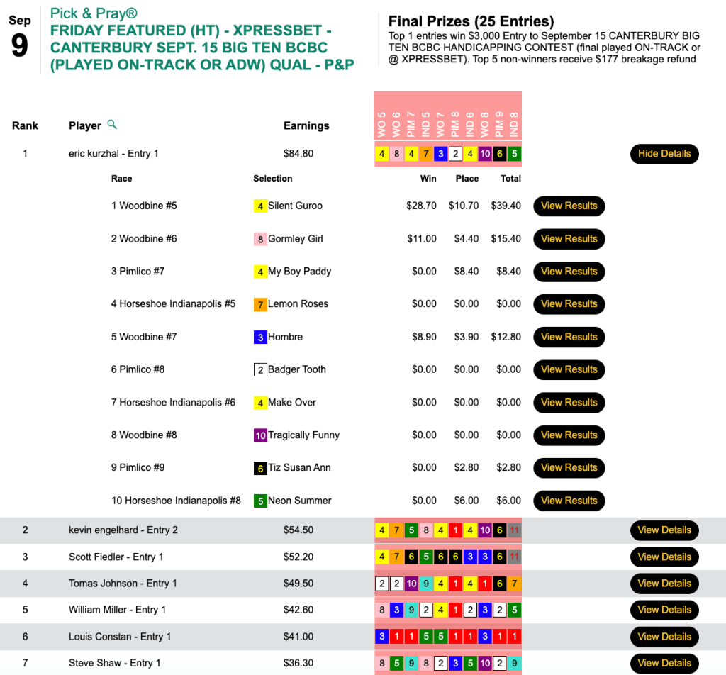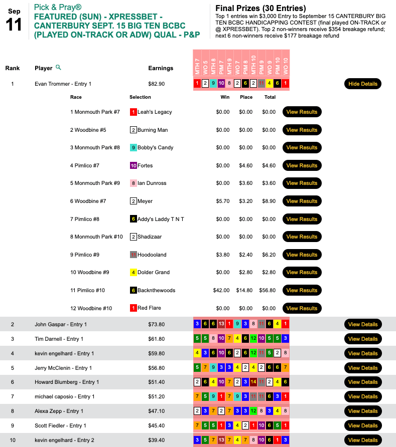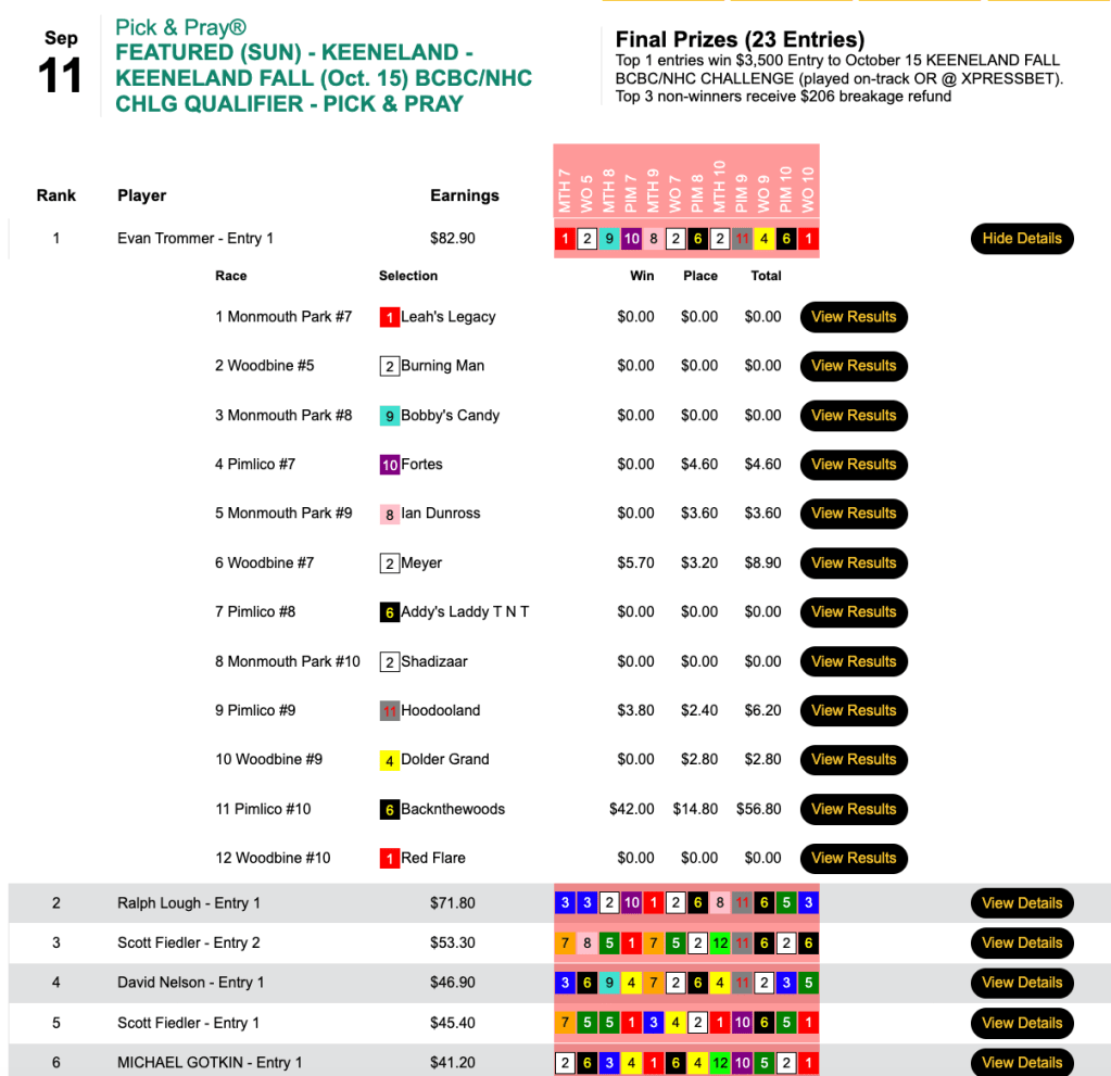 Trommer used the same 3-win, 3-place Pick & Pray selections to bag both a $3,000 Canterbury seat and a $3,500 Keeneland entry. Sunday’s $7,500 Guaranteed Big Bucks game, meanwhile, was a Live-format game, but that detail mattered not to Trommer.