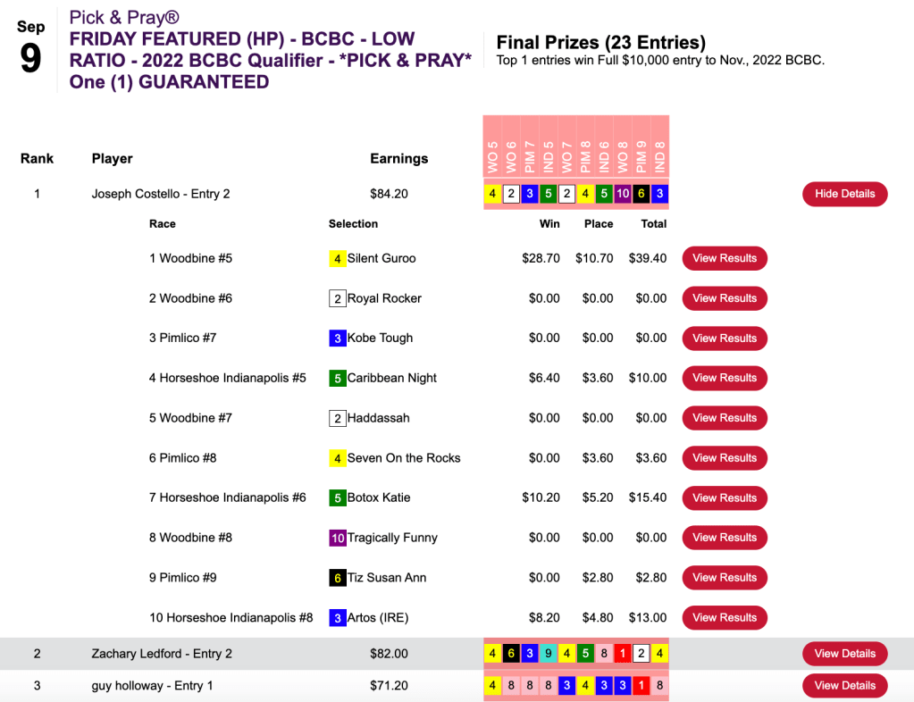 Costello (4 firsts, 2 seconds) had 13-1 Silent Guroo at the beginning…but he needed 3-1 Artos at the end… to get up for the $10,000 seat in Friday’s BCBC Low Ratio Pick & Pray.