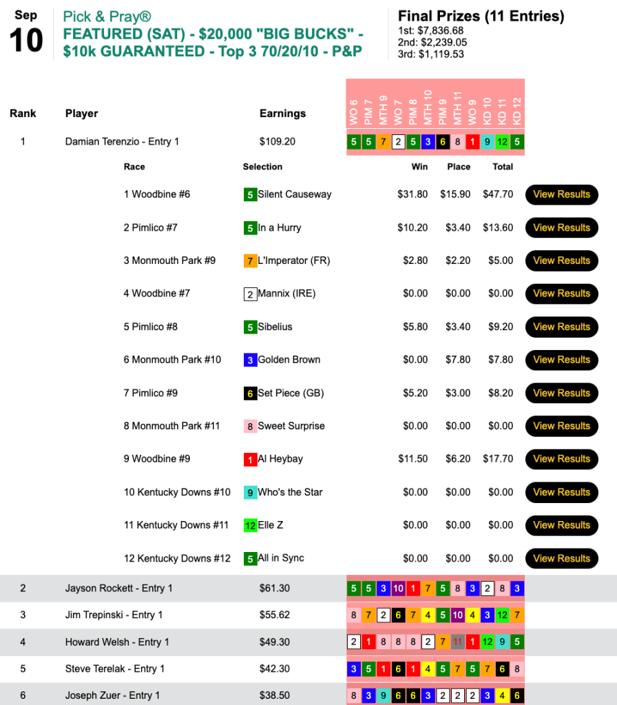 Damian Terenzio got the lion’s share ($7,836) of the eventual $11,195 purse by racking up 6 winners (including Silent Causeway) and 1 runner up.