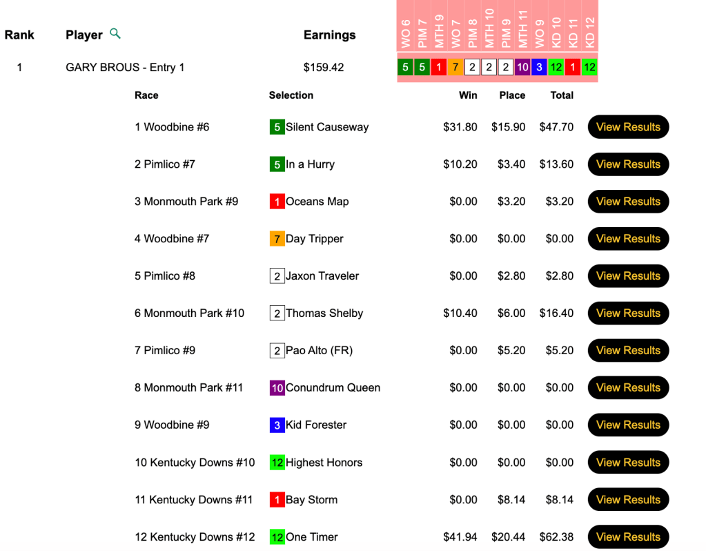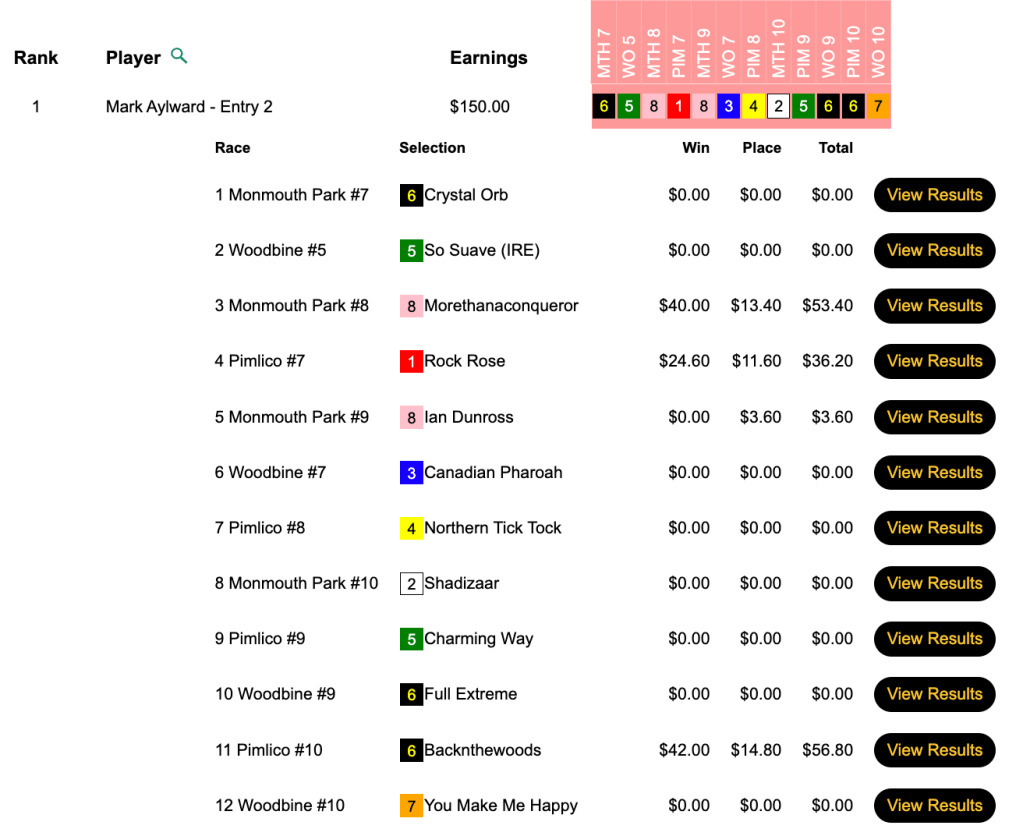 Congratulations to Michael Mulvihill (4 wins, 3 places), Charles Browning (4W, 0P) and Kevin Engelhard (5 places, followed by 2 winners). The top horse for Mulvihill and Engelhard was Backinthewoods ($43.20, $14.80) in the 10th at Pimlico. For Browning, it was Morethanaconqueror ($40.00, $13.40) in Monmouth race 8.