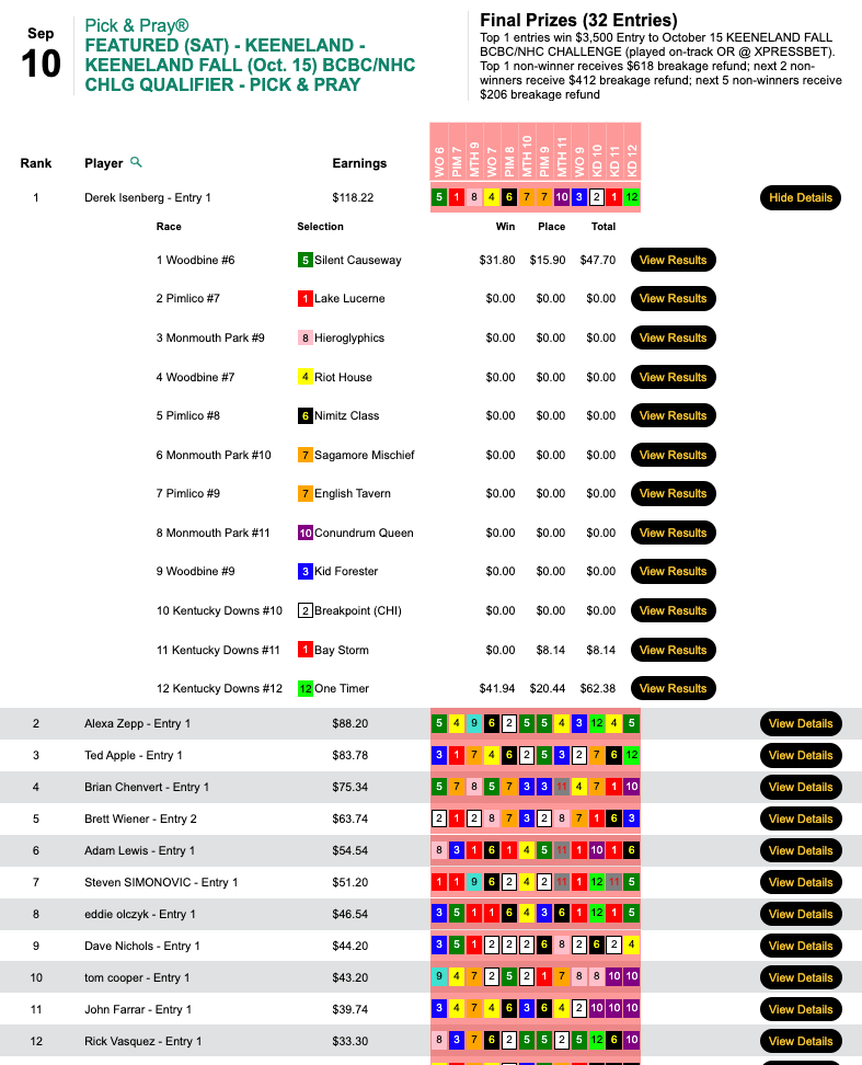 Derek Isenberg only picked 2 winners (plus one runner up) on Saturday, but those two winners were the two best of the day—Silent Causeway ($31.80, $15.90) in the 6th at Woodbine and One Timer ($41.94, $20.44) in the final contest race, the 12th at Kentucky Downs.