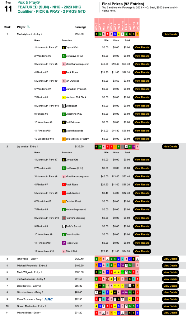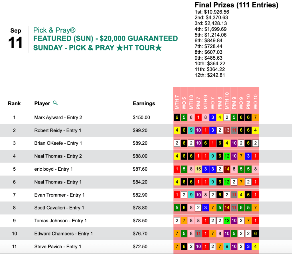 Aylward’s 3 victors returned $40.00, $24.60 and $43.20 in the win hole. The impressive show of force got him a victory worth $10,926 in Sunday’s HT Tour game, our $20,000 Pick & Pray (final purse: $24,281).