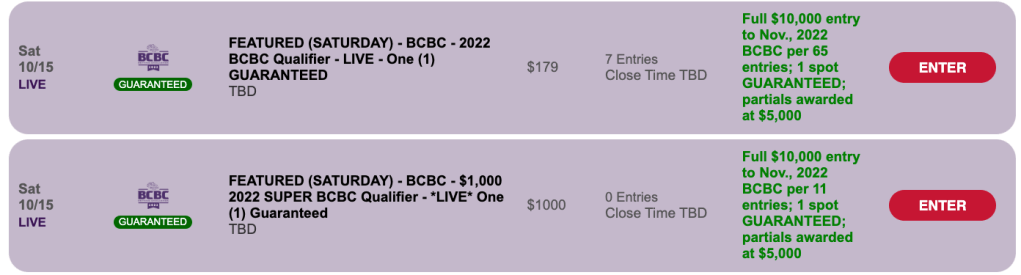 There will also be a Super Low Ratio offering. One seat is guaranteed here as well. The difference is that the entry fee is $1,000, and the winning ratio is 1-per-11. Because this event is guaranteed (and because the entry fee is high-end), this may be a good spot in which to pick up an overlaid BCBC berth.