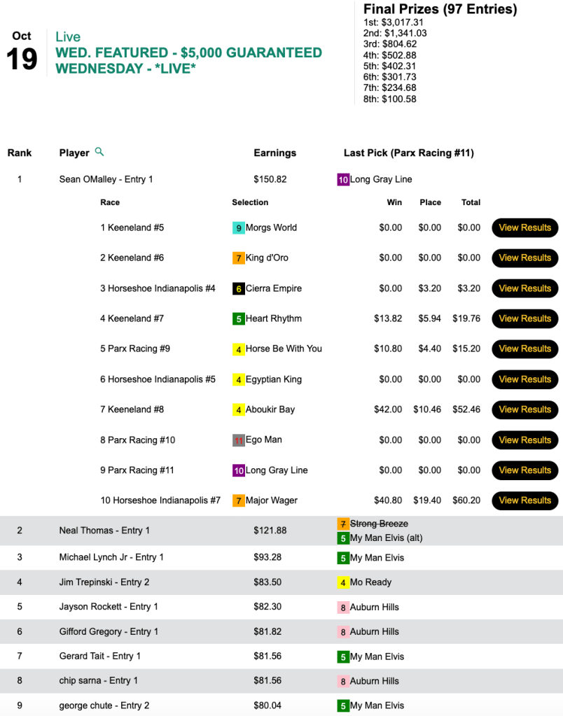 After a perfectly respectable first half of the tourney, O’Malley (4 firsts, 1 second) came up with both Aboukir Boy ($44.50, $10.46) in the 8th at Keeneland and Major Wager ($40.80, $19.40) in the final contest race, the 7th at Horseshoe Indy, to pocket the top prize of $3,017 in a game ultimately worth a total of $6,705.