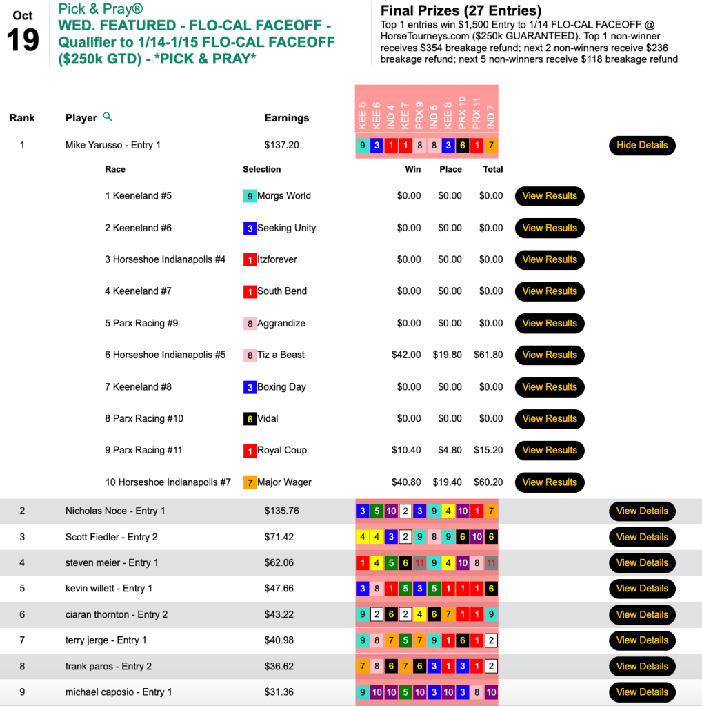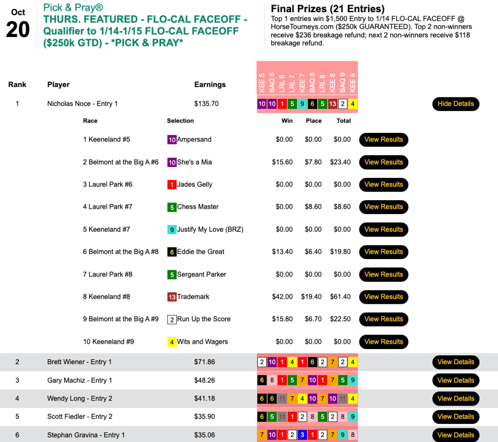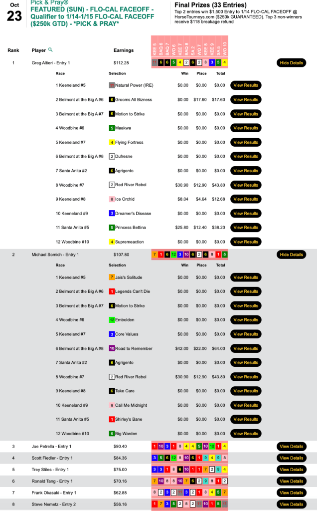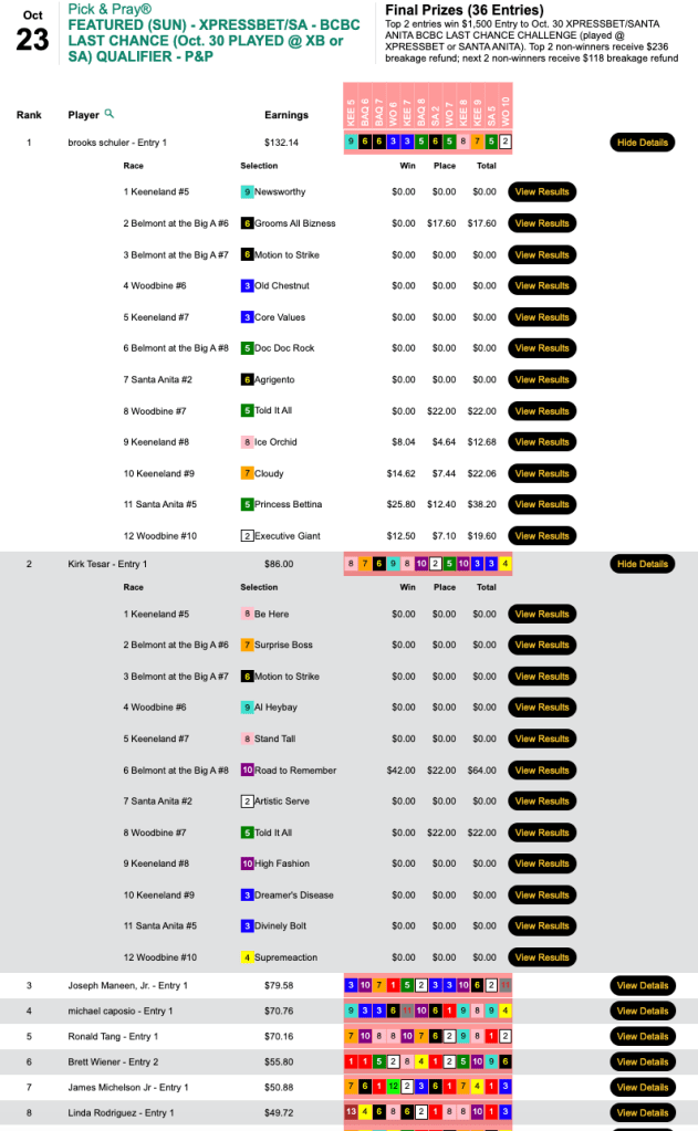 Scores were considerably higher in all other Sunday featured tourneys, including the Breeders’ Cup Betting Challenge Low Ratio qualifier at HorsePlayers.