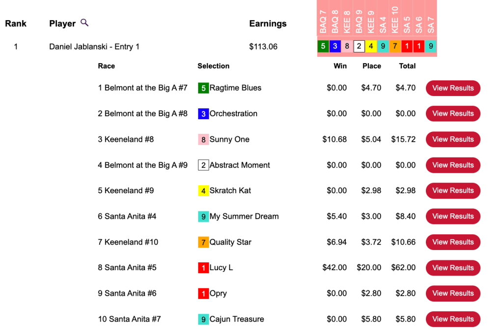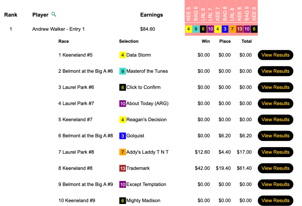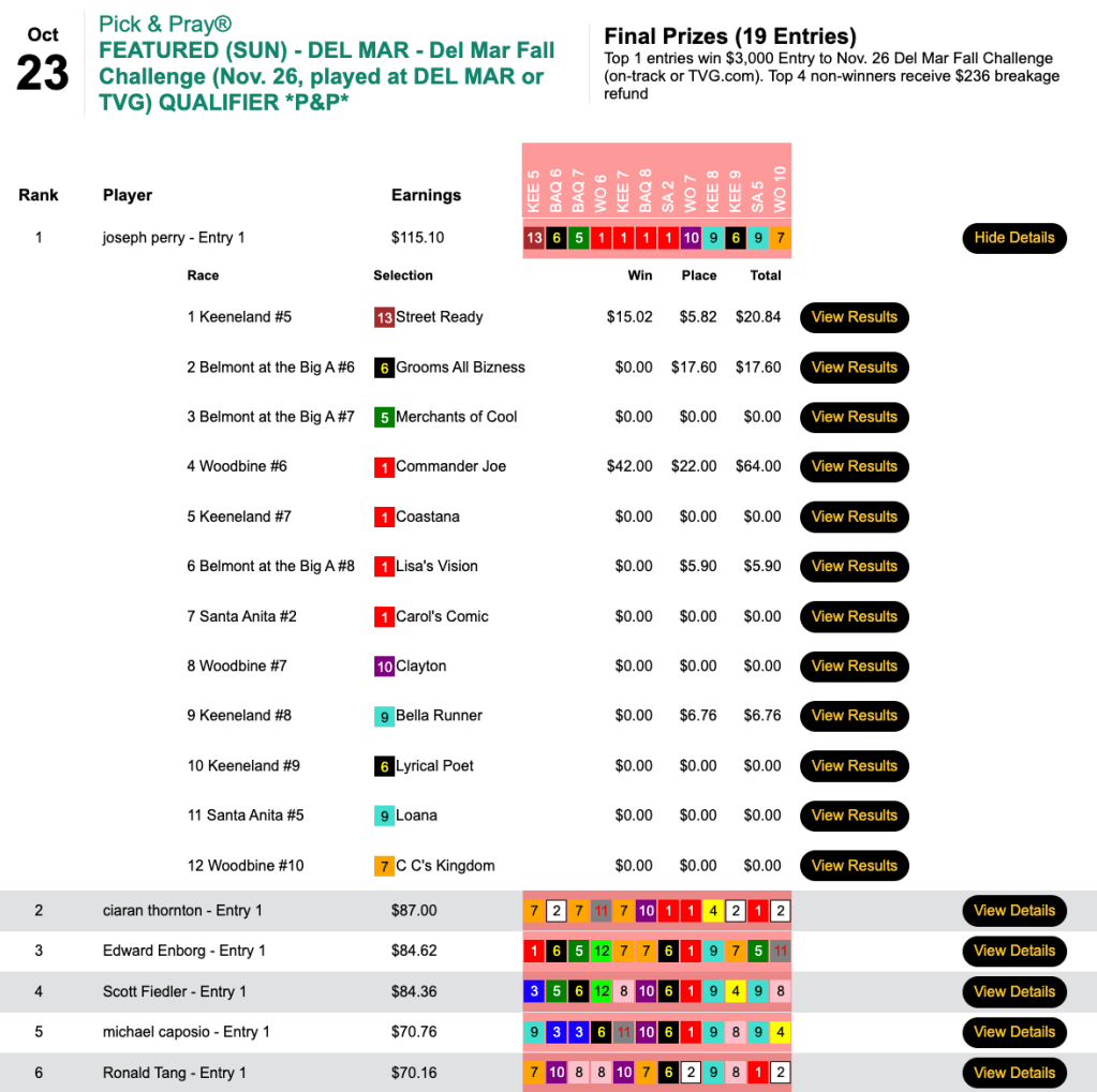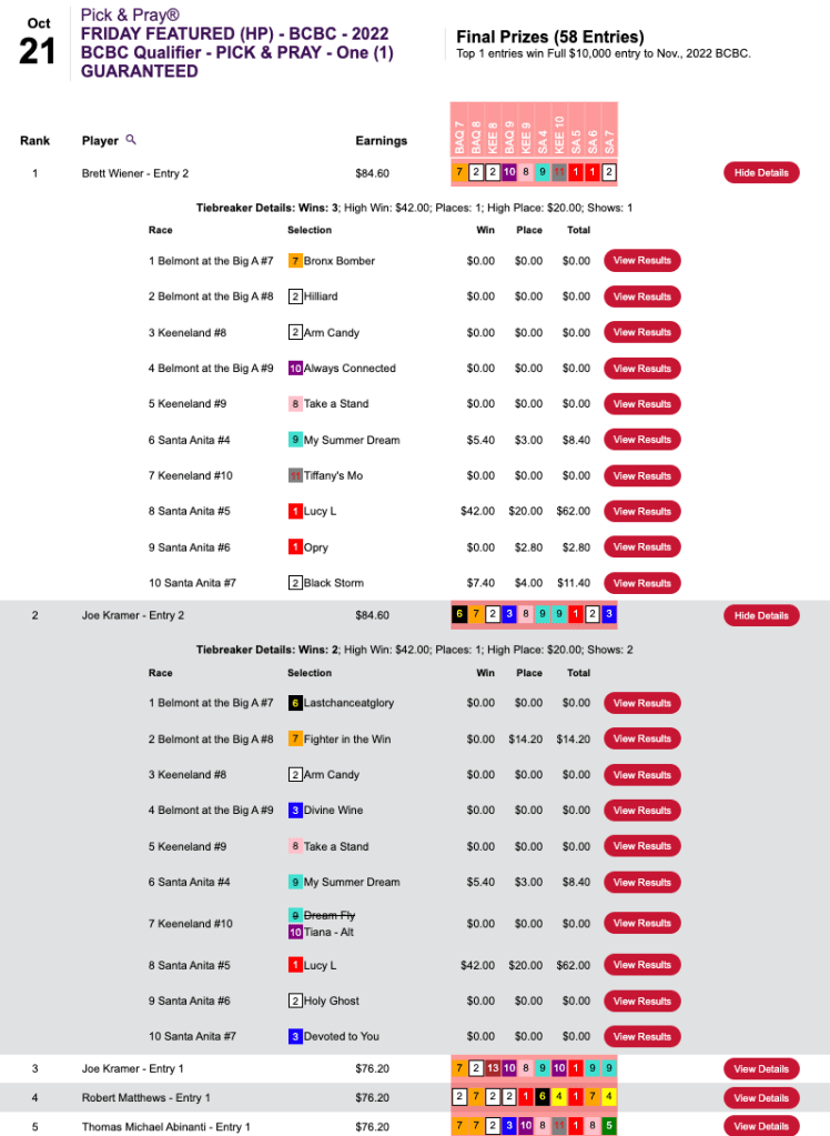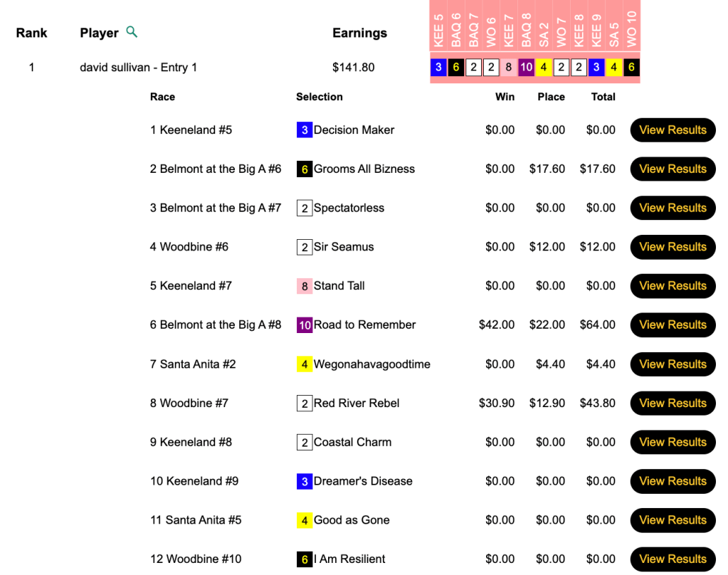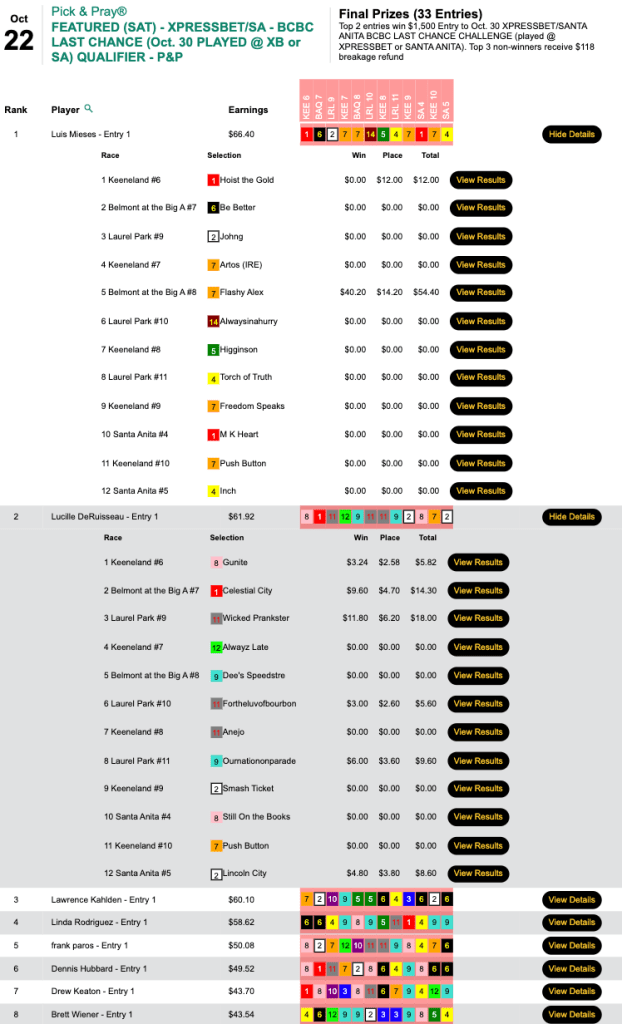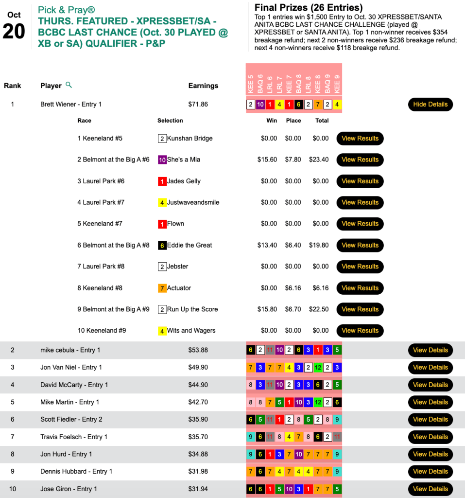 We’re running Breeders’ Cup Betting Challenge qualifiers pretty much every day between now and the BCBC, and Mike Thomas posted the best score of the day in capturing Thursday’s.
