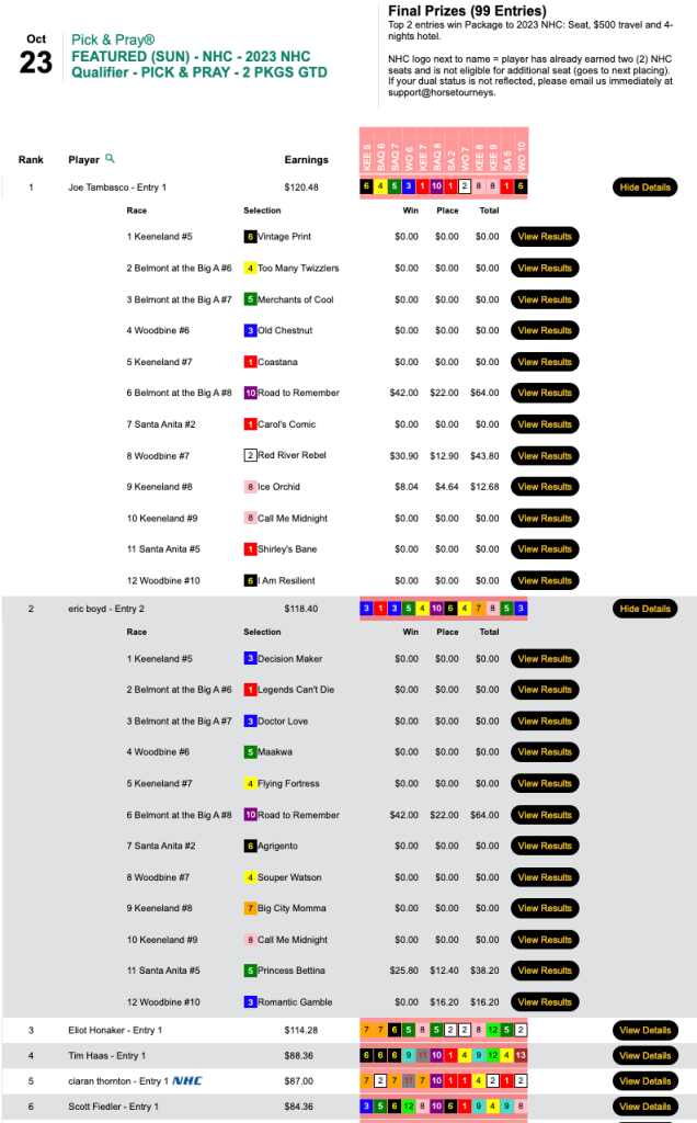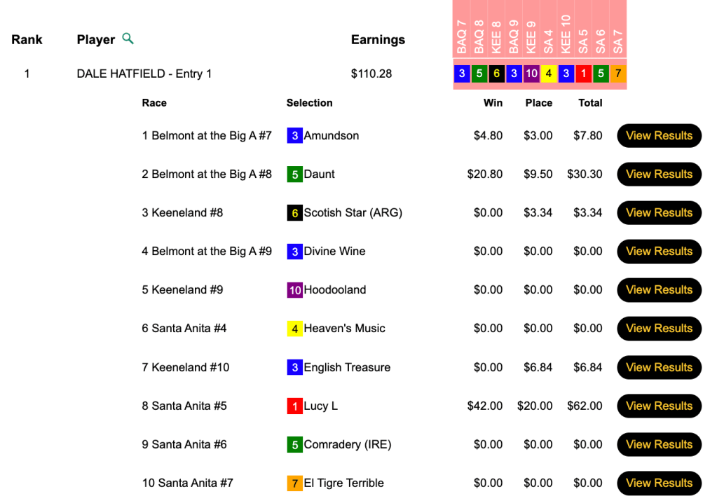 Hatfield won the feud—and $8,379—in Friday’s HT Tour event, our $15,000 Guaranteed Pick & Pray which closed with a pot of $18,620. It was also his second Friday victory of the HT Tour season, so he gets an extra $500 for that. Hatfield was aided immensely by Lucy L ($48.60, $20.00) in the 5th at Santa Anita. And Lucy L was a Warrior Princess for him as well in Friday’s $75 NHC qualifier at HorsePlayers.