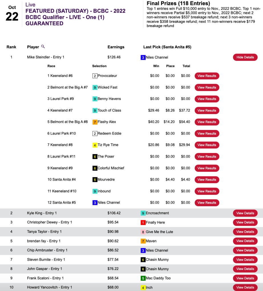 Mike Steindler’s scorecard was almost as good as Willett’s…but things were closer in Saturday’s 118-entry Breeders’ Cup Betting Challenge qualifier at HorsePlayers.