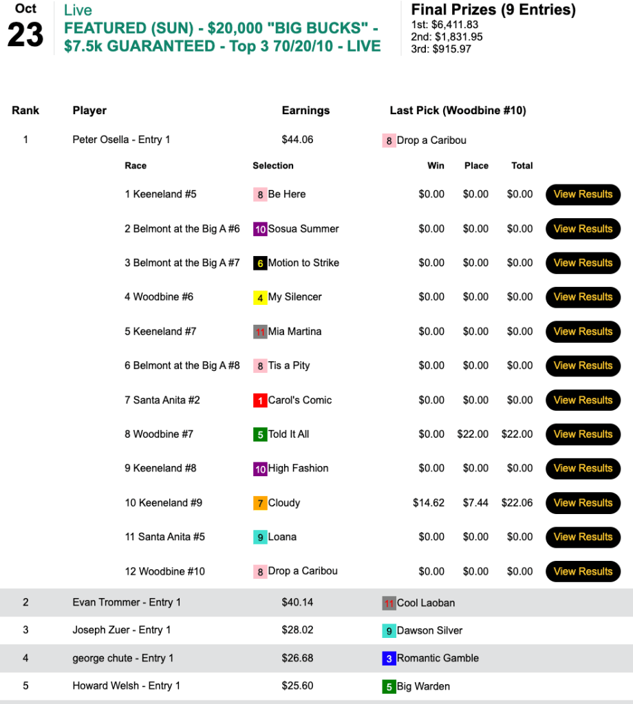 A score of $44.06 got the job done for Osella in Sunday’s $7,000 Big Bucks game. No one turned a flat bet profit in the field of 9, and Osella was one of just two to reach $40. Nonetheless he picked up $6,411 from a final purse of $9,159.