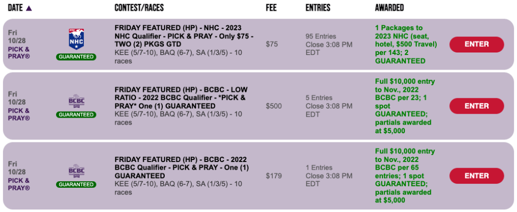 The less expensive Breeders’ Cup Betting Challenge qualifier on Friday is a $179 buy-in Pick & Pray with one seat guaranteed and an entry fee of $179. The winning ratio works out to 1-per-65.