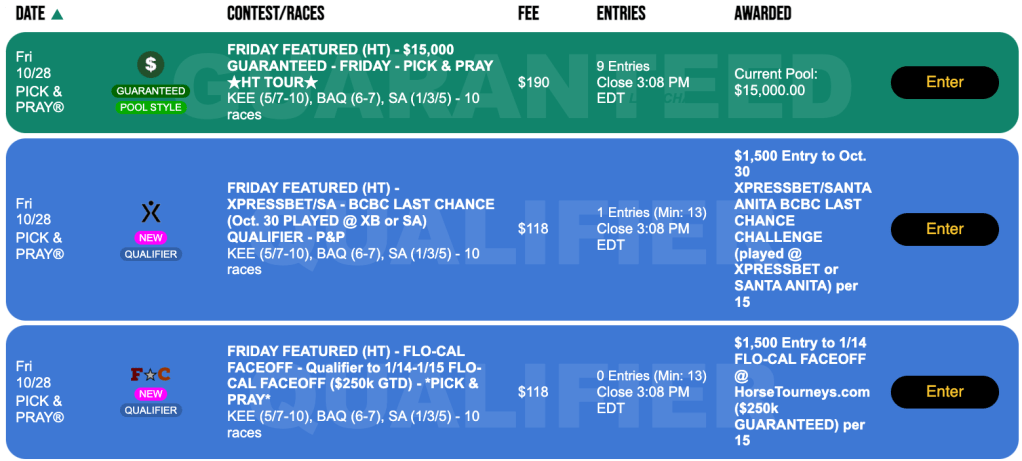 Time for the October 30 Santa Anita BCBC Challenge—playable at Santa Anita or online at Xpressbet—is drawing near. There’s a Friday Pick & Pray qualifier for it in which one of every 15 entrants—at $118 per entry—will grab a $1,500 seat for Sunday, when BCBC seats and cash will be at stake.