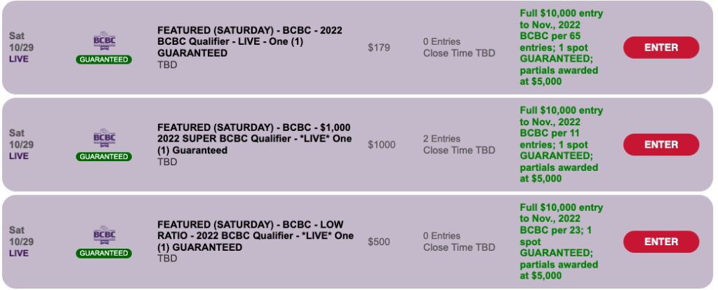 In ascending order of entry fee…there’s a standard $179 qualifier with one $10,000 BCBC seat certain. The winning ratio is 1-per-65.