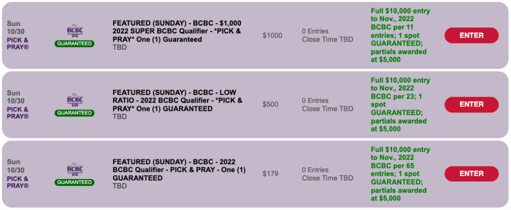 There’s also a $500 Low Ratio Pick & Pray on the Friday table of contents. Here, the winning ratio is 1-per-23, and, again, one $10,000 entry is guaranteed.
