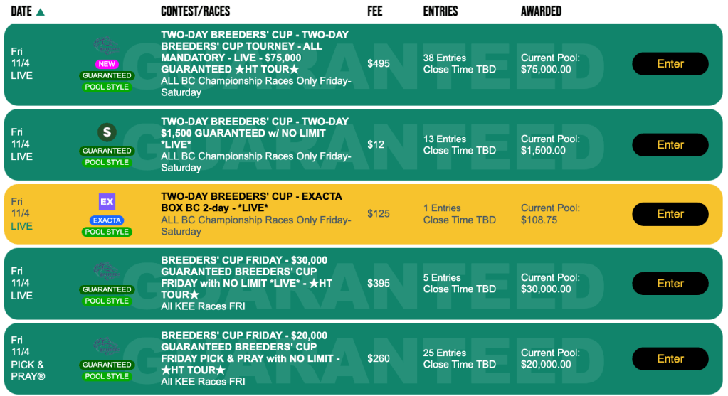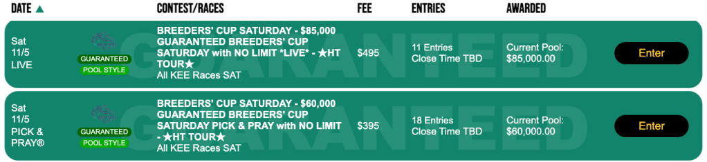 There are $30,000 Guaranteed (Live) and $20,000 Guaranteed (Pick & Pray) full-card Friday tourneys available, and $85,000 Guaranteed (Live) and $60,000 (Pick & Pray) full-card Saturday games. If you just want to play the 14 Breeders’ Cup races on Friday (5) and Saturday (9), there’s a two-day, Live-format tourney tailored to that as well. It has a purse guarantee of $75,000