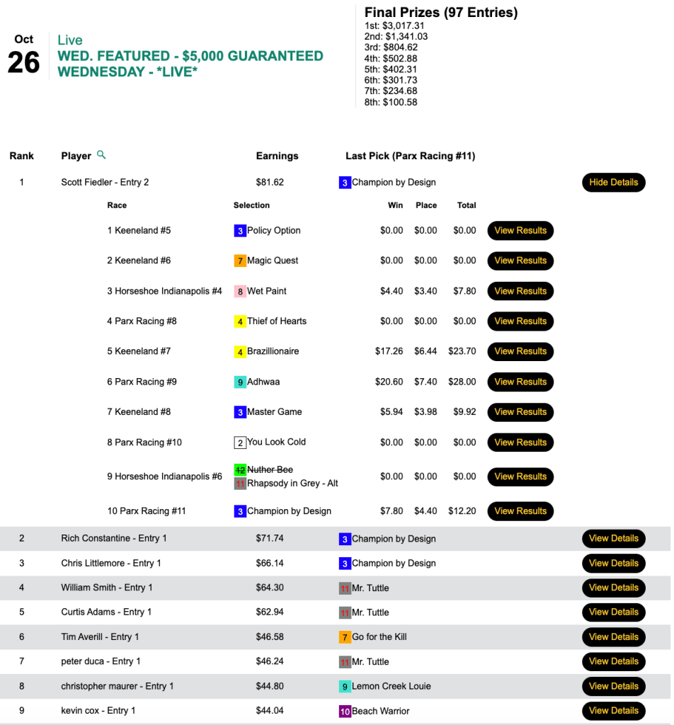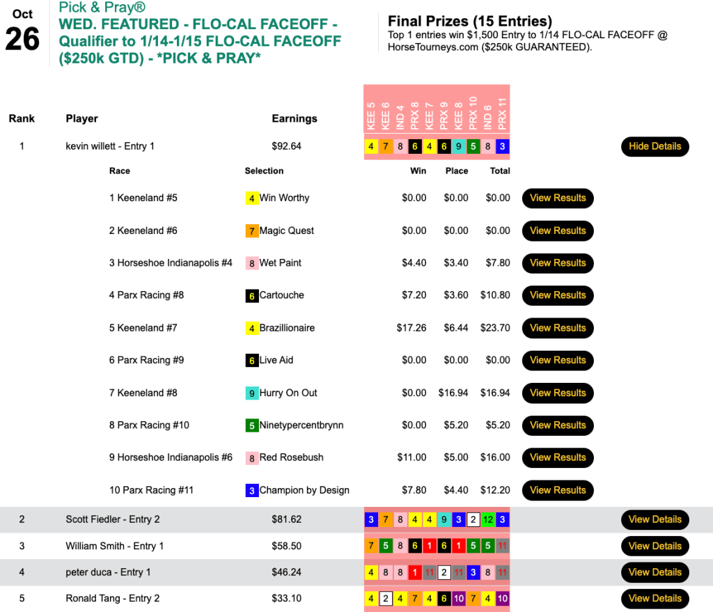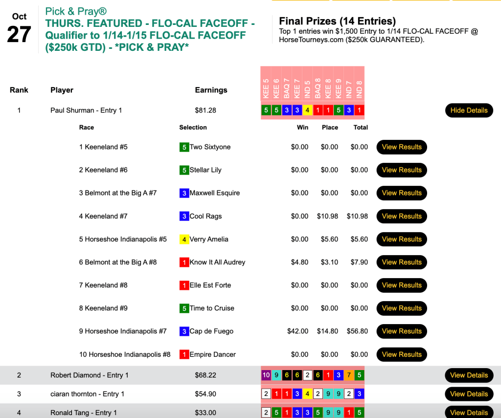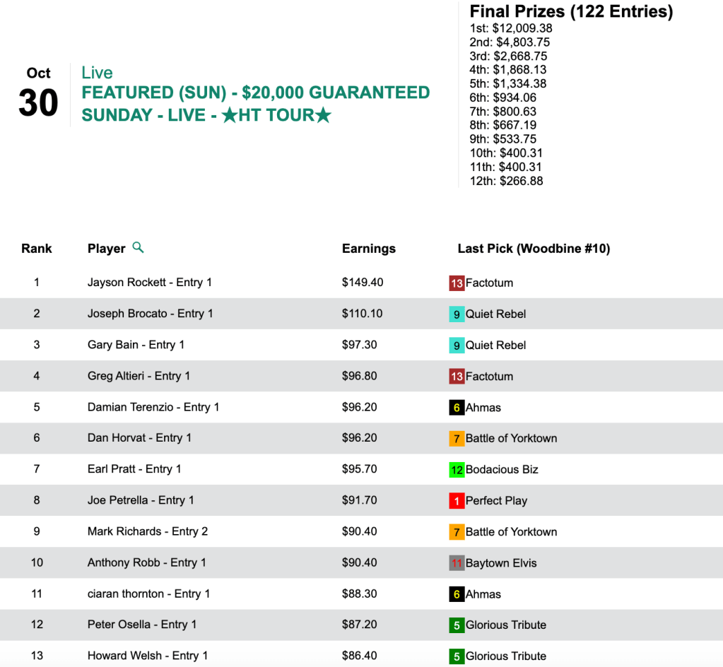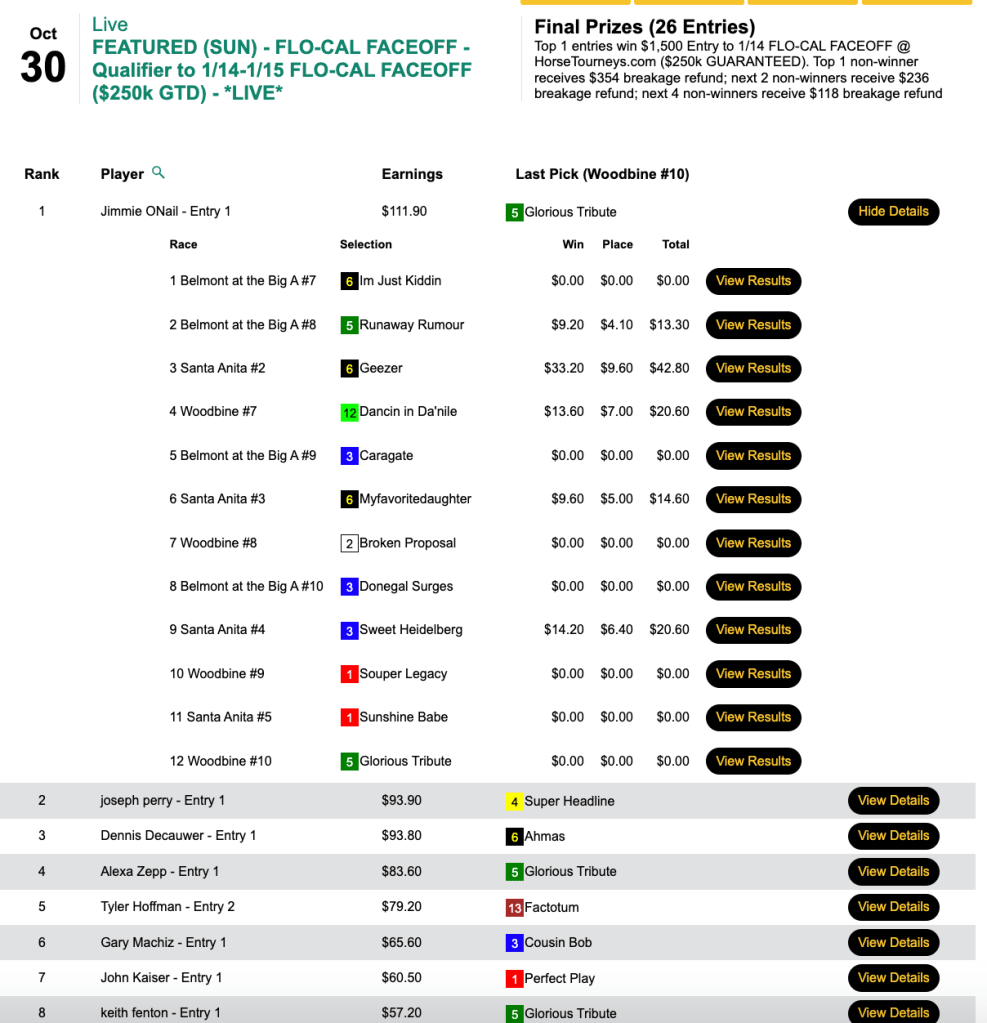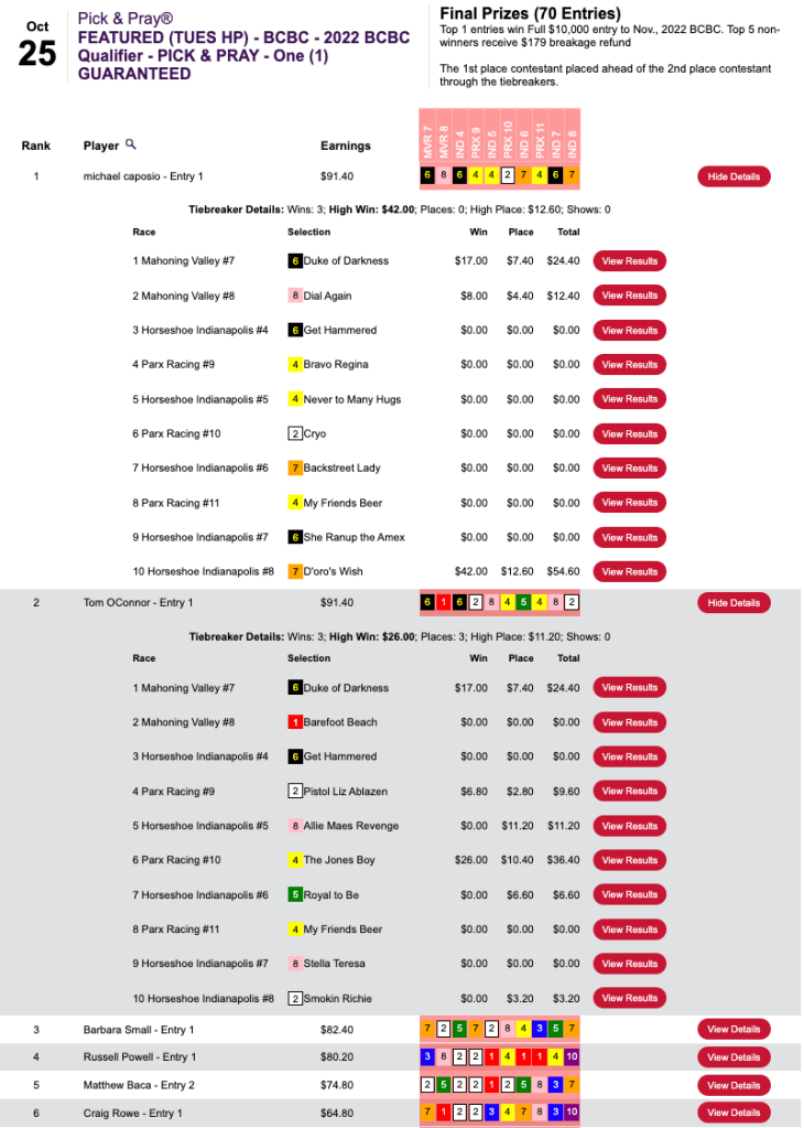 Since our first tiebreaker is number of wins and our second tiebreaker is “high win price”, it meant that Caposio won the tiebreaker and the $10,000 seat since O’Connor’s top winner paid $26.00.