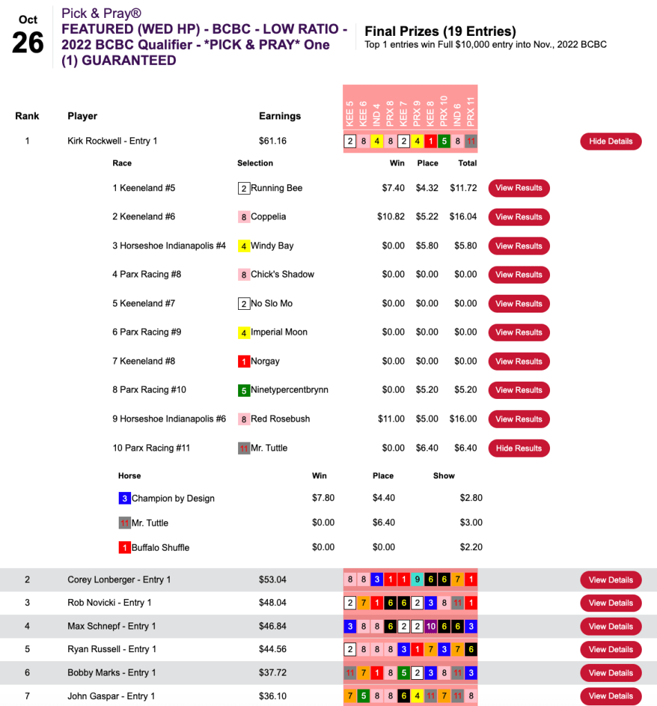 Pettit augmented the “longshot” with 4 other winners and 2 runners up to prevail in Friday’s $179 BCBC qualifier at HorsePlayers.